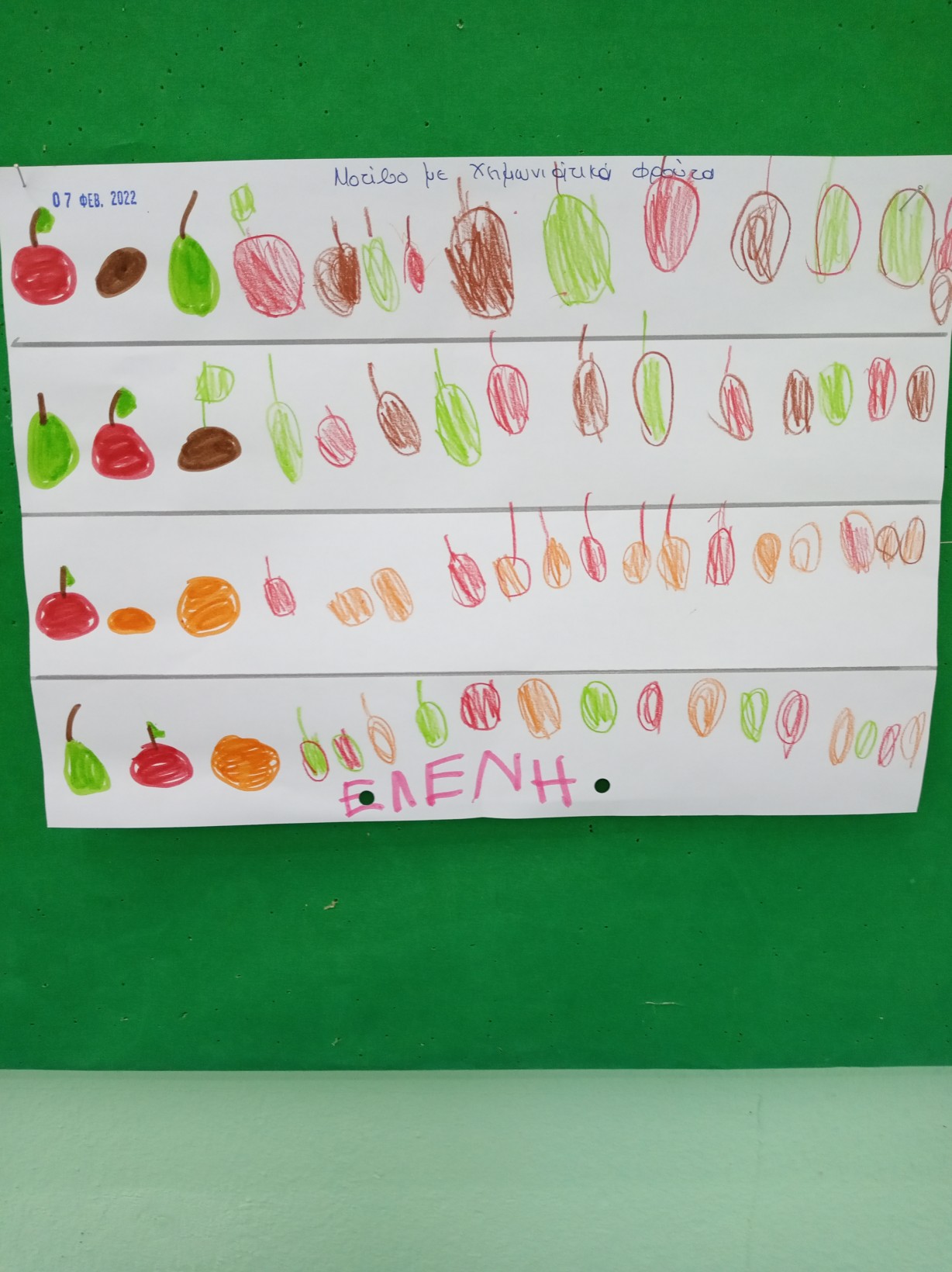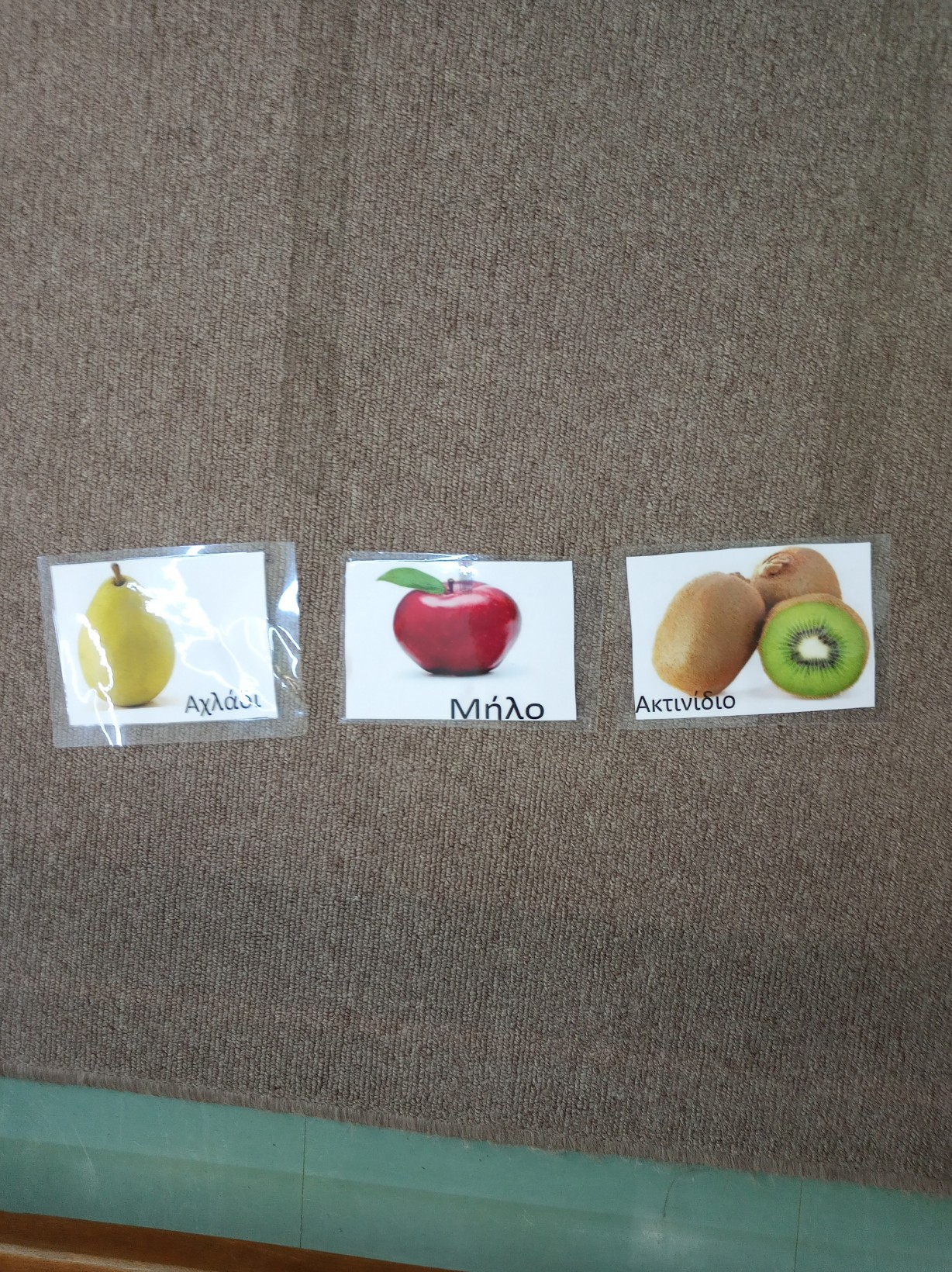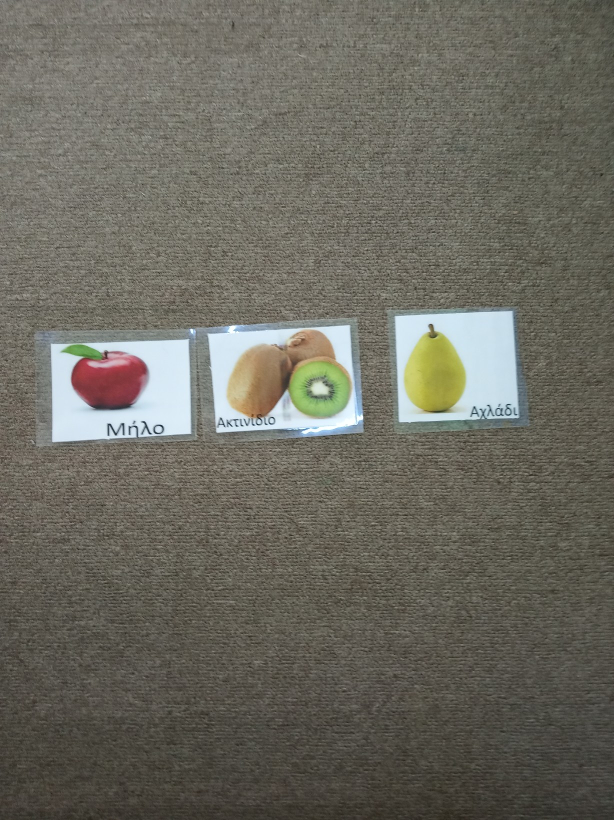 Αναρωτηθήκαμε τι φρούτα τρώμε το χειμώνα . Παρατηρήσαμε τι φρούτα φέρνουμε στο πρωινό μας και αυτά μας οδήγησαν στο συμπέρασμα ότι τα χειμωνιάτικα φρούτα είναι ΤΟ ΠΟΡΤΟΚΆΛΙ. ΤΟ ΜΑΝΤΑΡΙΝΙ , ΤΟ ΑΚΤΙΝΙΔΙΟ , ΤΟ ΜΗΛΟ και ΤΟ ΑΧΛΑΔΙ . Τα έφερα στο σχολείο και φυσικά αφού τα αγγίξαμε, τα μυρίσαμε και τα περιγράψαμε, τα δοκιμάσαμε . Στη συνέχεια παίξαμε με καρτέλες των φρούτων