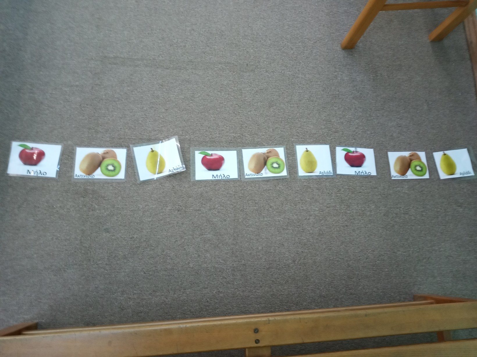 Φτιάξαμε μοτίβο με τα φρούτα. Τα παιδιά χωρίστηκαν σε ομάδες των δύο και η κάθε ομάδα έφτιαξε ένα μοτίβο με τα χειμωνιάτικα φρούτα. Στη συνέχεια το αποτυπώσαμε στο χαρτί.