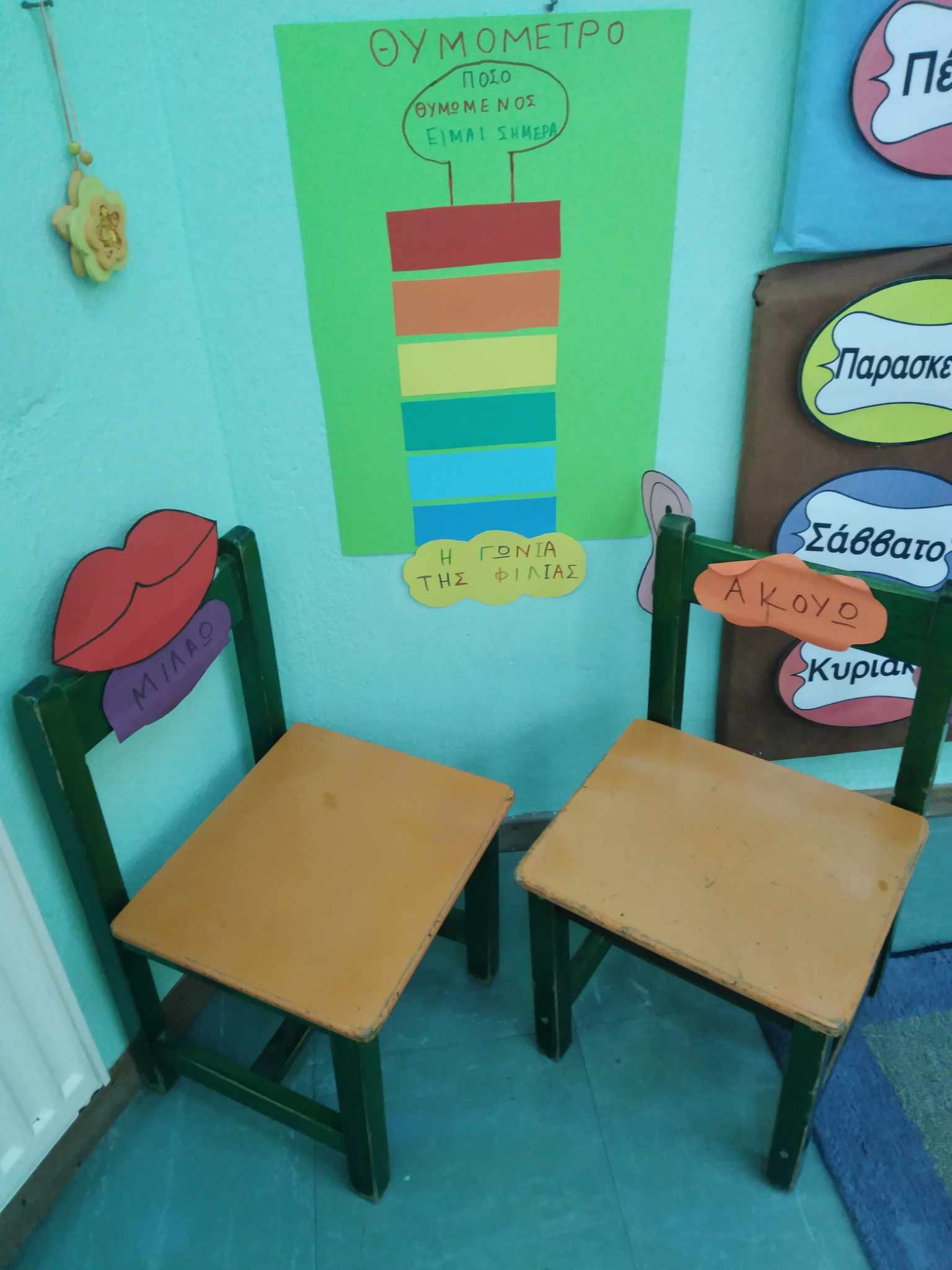 Έχει παρατηρηθεί στην αρχή της σχολικής χρονιάς να συγκεντρώνονται πολλά νήπια στις δημοφιλείς γωνιές, με αποτέλεσμα να αρχίζουν να διαπληκτίζονται μεταξύ τους. Τα νήπια λόγω εγωκεντρικότητας αδυνατούν να μοιραστούν τα παιχνίδια, δε λύνουν τις διαφορές τους ήρεμα συζητώντας με τα άλλα παιδιά και μπορεί να χτυπηθούν ακόμη. Επίσης η νηπιαγωγός μίλησε στα παιδιά για τα συναισθήματα που έχουμε όταν διαπληκτιζόμαστε και για το τί νιώθουμε όταν είμαστε θυμωμένοι και τί μπορούμε να κάνουμε για να κατευνάσουμε τον θυμό μας και τα όποια αρνητικά συναισθήματα. Συζητήσαμε, προτείναμε, επιλέξαμε και αποφασίσαμε να φτιάξουμε μια ζεστή γωνιά διαλόγου και επίλυσης των προβλημάτων. Ένα αυτί και ένα στόμα….μιλάω ακούω καθώς κι ένα θυμόμετρο έτσι φροντίσαμε για την διακόσμηση της γωνιάς αυτής στην τάξη μας..
