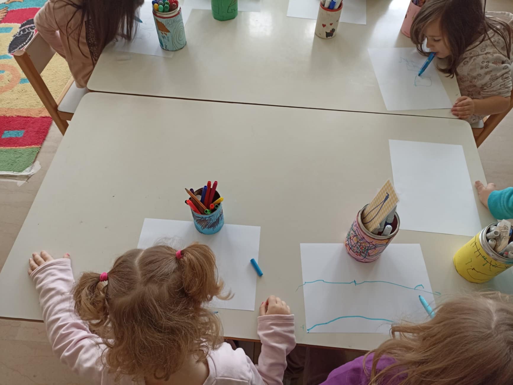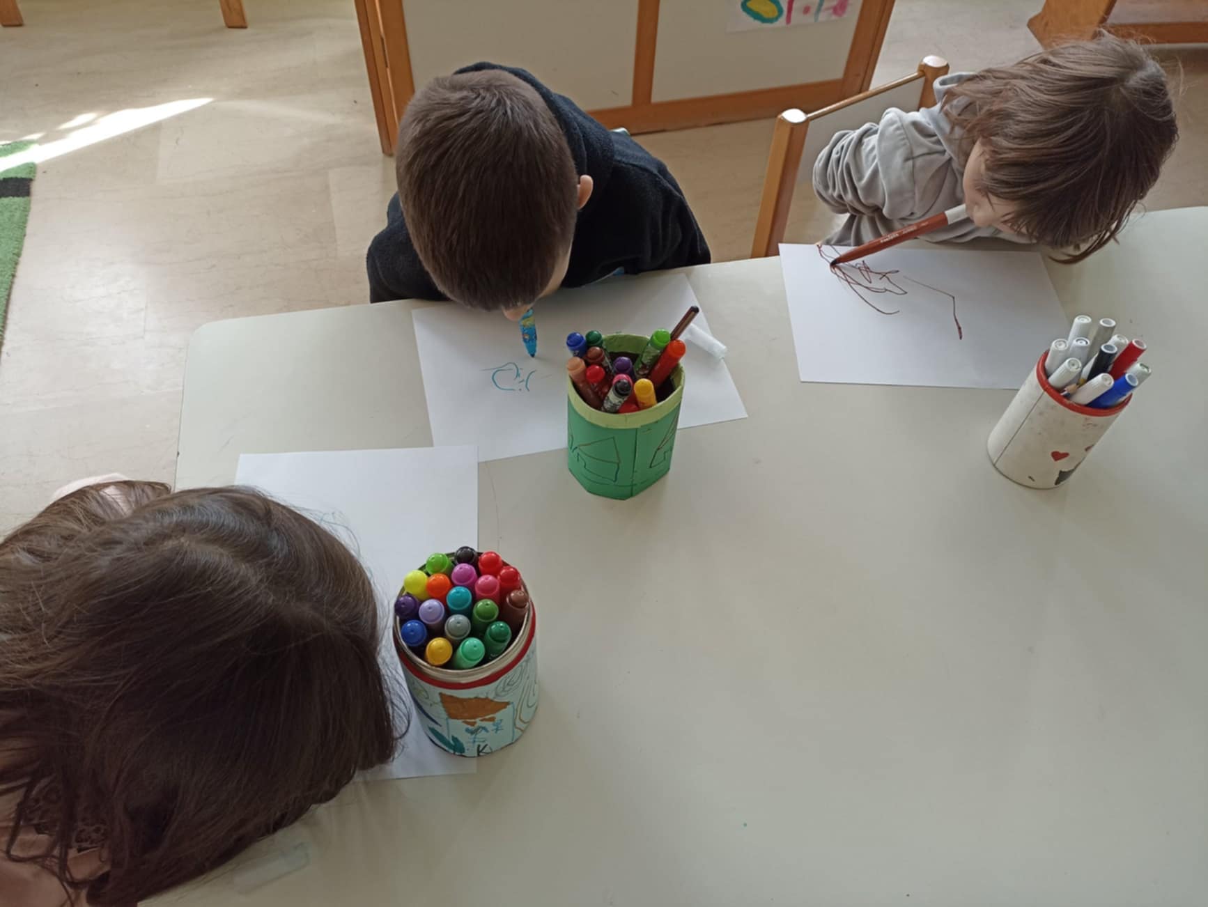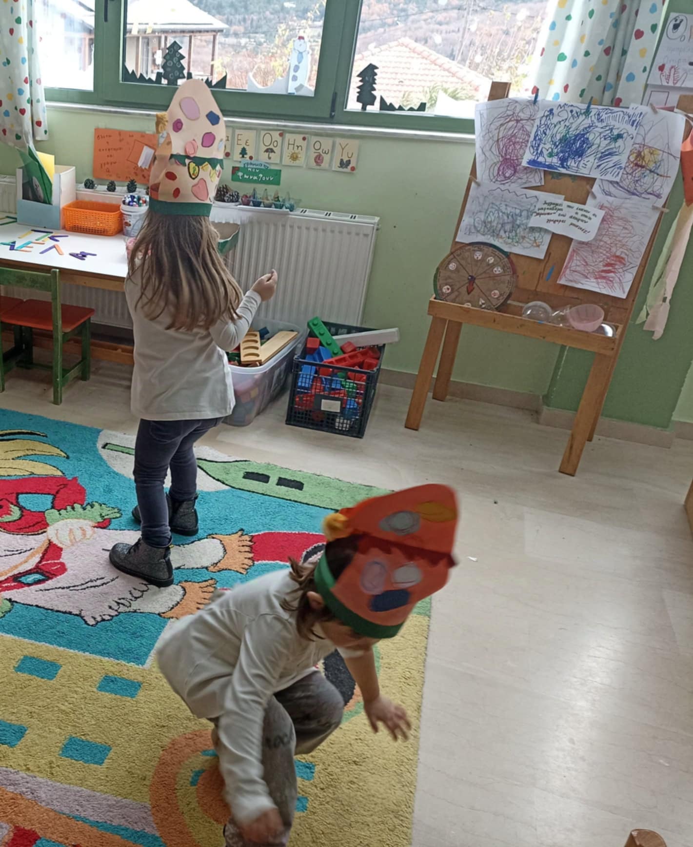 Στολίσανε τα σκουφιά από τους ρόλους τους γιατί θα παίξουν τα νανάκια στο κοινό θεατρικό που θα κάνουμε για τα Χριστούγεννα μαζί με το Δημοτικό..