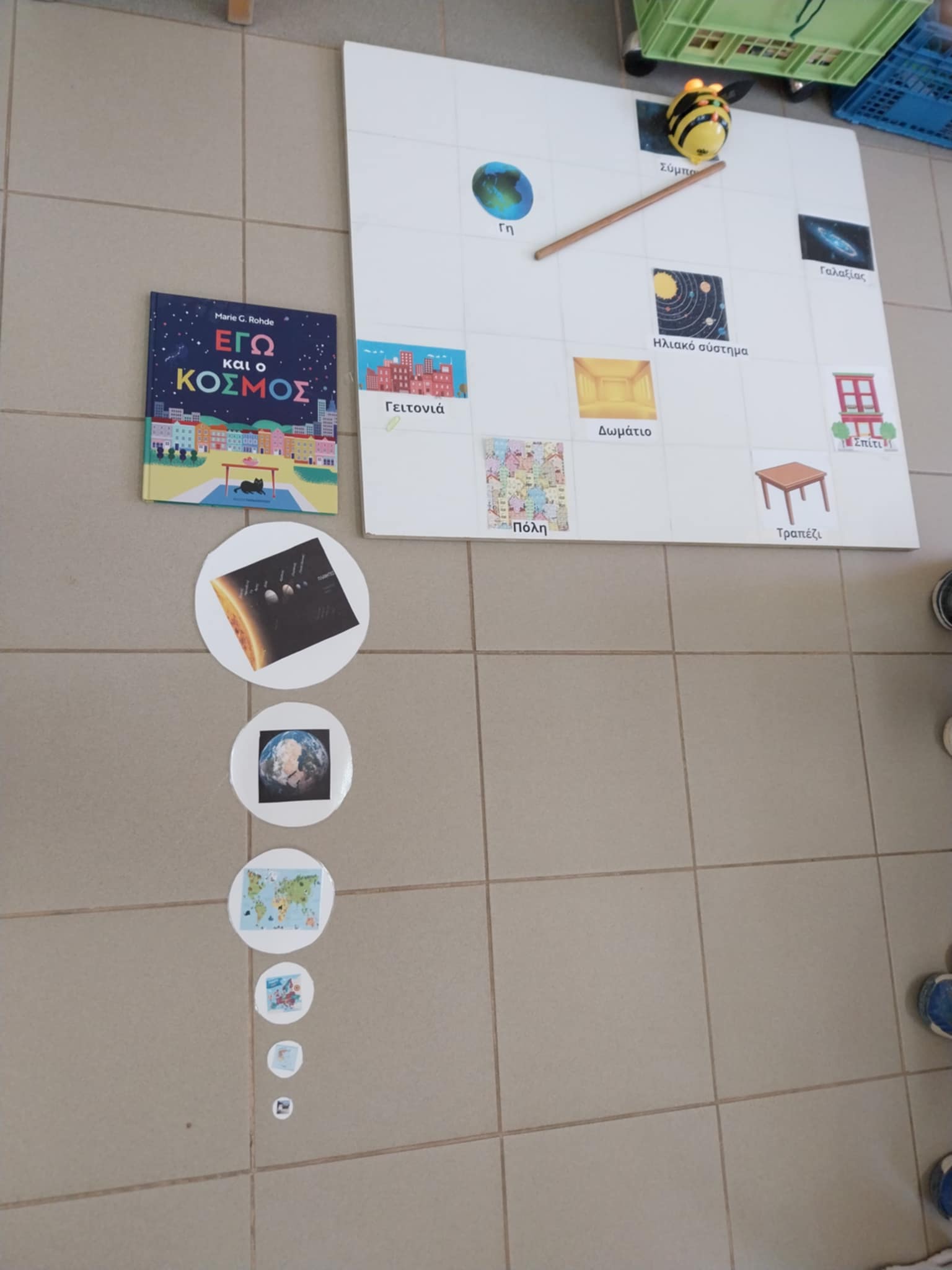 4. Αφήγηση παραμυθιού με τίτλο «ΕΓΩ ΚΑΙ Ο ΚΟΣΜΟΣ», του Marie G. Rohde. Έπειτα ζητήθηκε από τα παιδιά να σειροδετήσουν κάρτες από το εγώ στο σύμπαν. Τέλος έγινηε προγραμματισμός της Bee bot με βάση τα στοιχεία που μας έδινε το συγκεκριμένο παραμύθι.