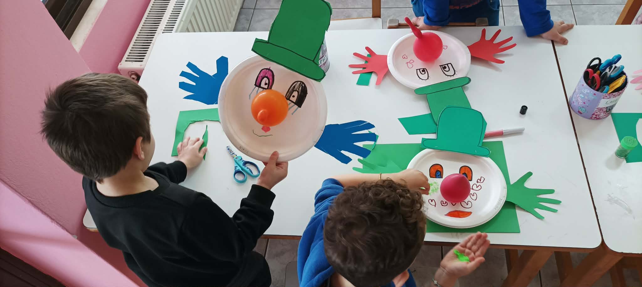 Την εβδομάδα της τσικνοπέμπτης συνεχίσαμε την θεματική “απόκριες” με εστίαση στους κλόουν! Κάναμε τους εαυτους μας κλόουν με γκοφρέ χαρτι, φτιάξαμε μικρούς κλόουν απο πιατα μιας χρήσης και διακοσμησαμε τις πορτες. Την ημέρα της τσικνοπέμπτης καναμε παρτυ με στολές και σερπαντίνες και φαγαμε σουβλάκια! Παιξαμε “the floor is lava”, “κολλα την ουρα του γαϊδάρου” και “μπαλονοδρομίες”. Την Παρασκευή κάναμε δύο φύλλα εργασίας όπου συνθέσαμε τη λέξη “μασκα” και ενώσαμε τα γεωμετρικά σχήματα με τον κλόουν που τα είχε στα ρουχα του 🤡.