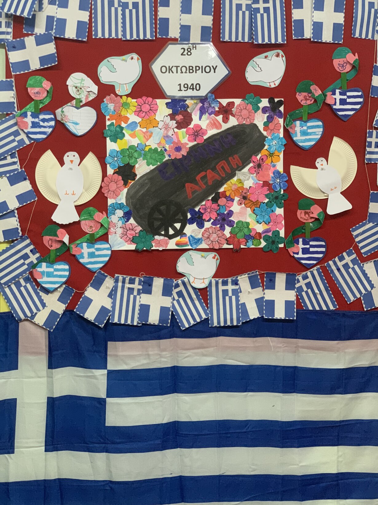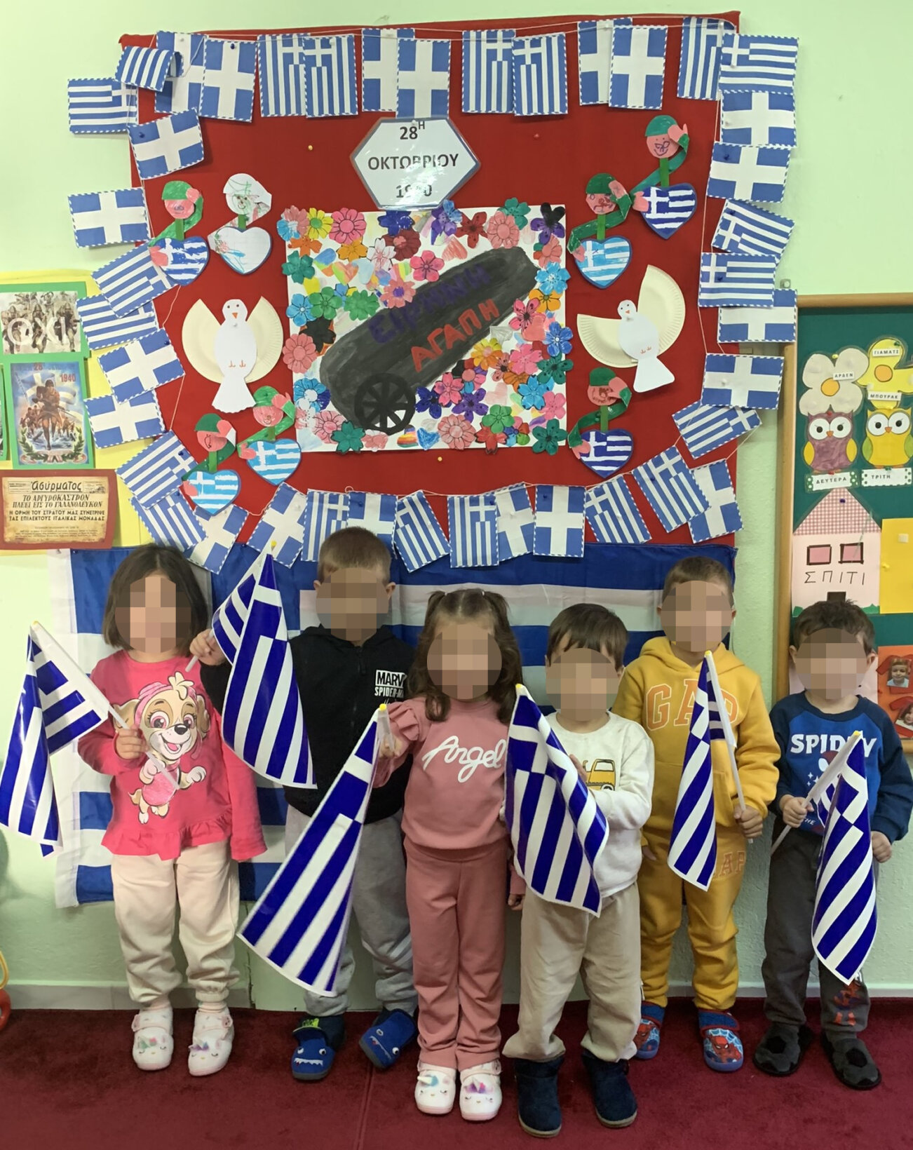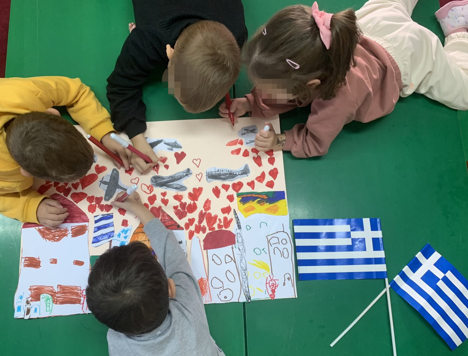 Η 28η Οκτωβρίου είναι μια μέρα που μας θυμίζει πόσο σημαντική είναι η ειρήνη και η ελευθερία για όλους τους ανθρώπους. Στο νηπιαγωγείο, γιορτάσαμε αυτή τη μέρα με ποικίλες δραστηριότητες που μας βοήθησαν να καταλάβουμε καλύτερα την αξία αυτών των δύο σημαντικών εννοιών. Τα παιδιά απήγγειλαν ποιήματα και τραγούδησαν για την 28η Οκτωβρίου, εκφράζοντας τη χαρά αλλά και το σεβασμό τους στους πεσόντες ήρωες που πολέμησαν για την ελευθερία. Επίσης, διαβάσαμε το παραμύθι “Το Κανόνι της Ειρήνης”, το οποίο τονίζει τη σημασία της ειρηνικής συνύπαρξης. Μετά την ανάγνωση, τα παιδιά δημιούργησαν ομαδικά έργα, εμπνευσμένα από το παραμύθι, εκφράζοντας έτσι την ανάγκη για παγκόσμια ειρήνη, αγάπη και ευημερία (“Α’ Θεματικό Πεδίο: Παιδί και Επικοινωνία” και Δ’ Θεματικό Πεδίο: Παιδί Δημιουργία και Έκφραση” του νέου αναλυτικού προγράμματος σπουδών νηπιαγωγείου).