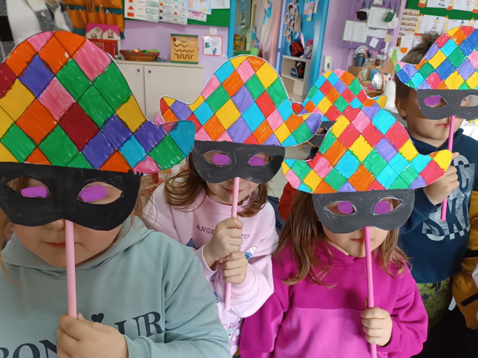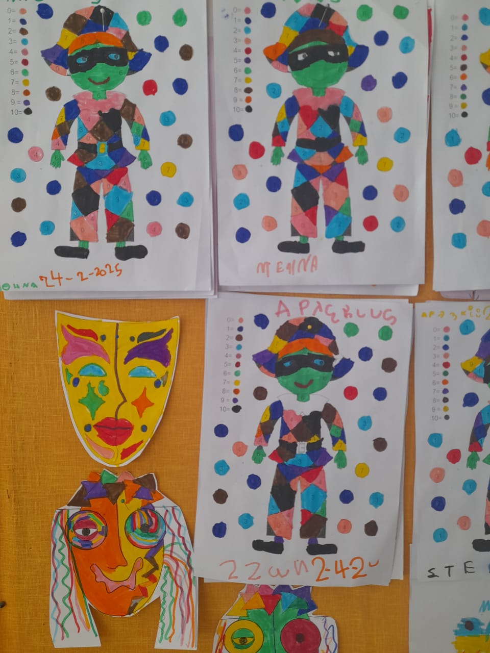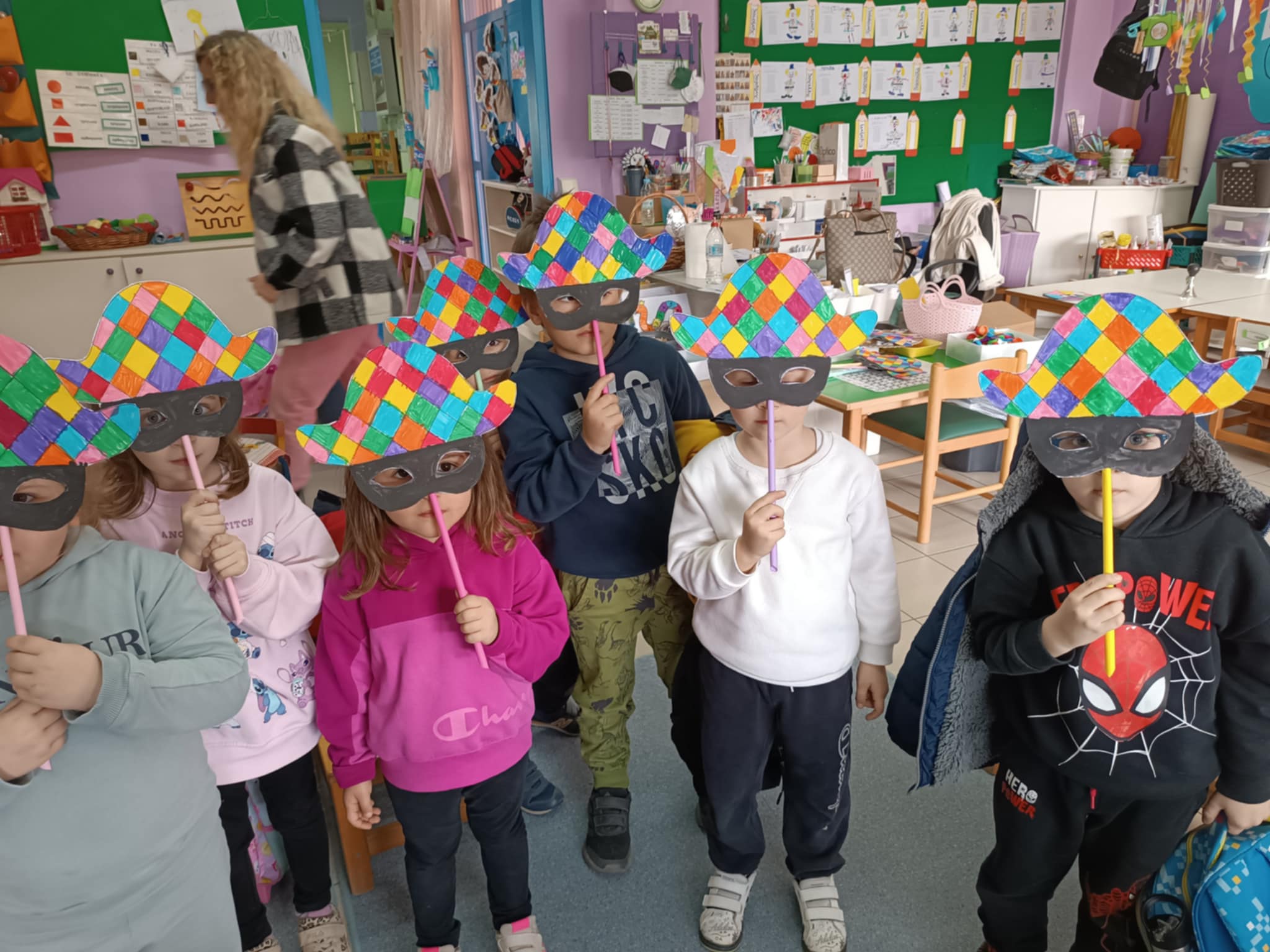 🎭 Μάσκες: Χρησιμοποιήσαμε χαρτόνι και διάφορα διακοσμητικά υλικά για να φτιάξουμε αποκριάτικες μάσκες. Κάθε παιδί δημιούργησε τη δική του μοναδική μάσκα και τη φόρεσε με καμάρι!