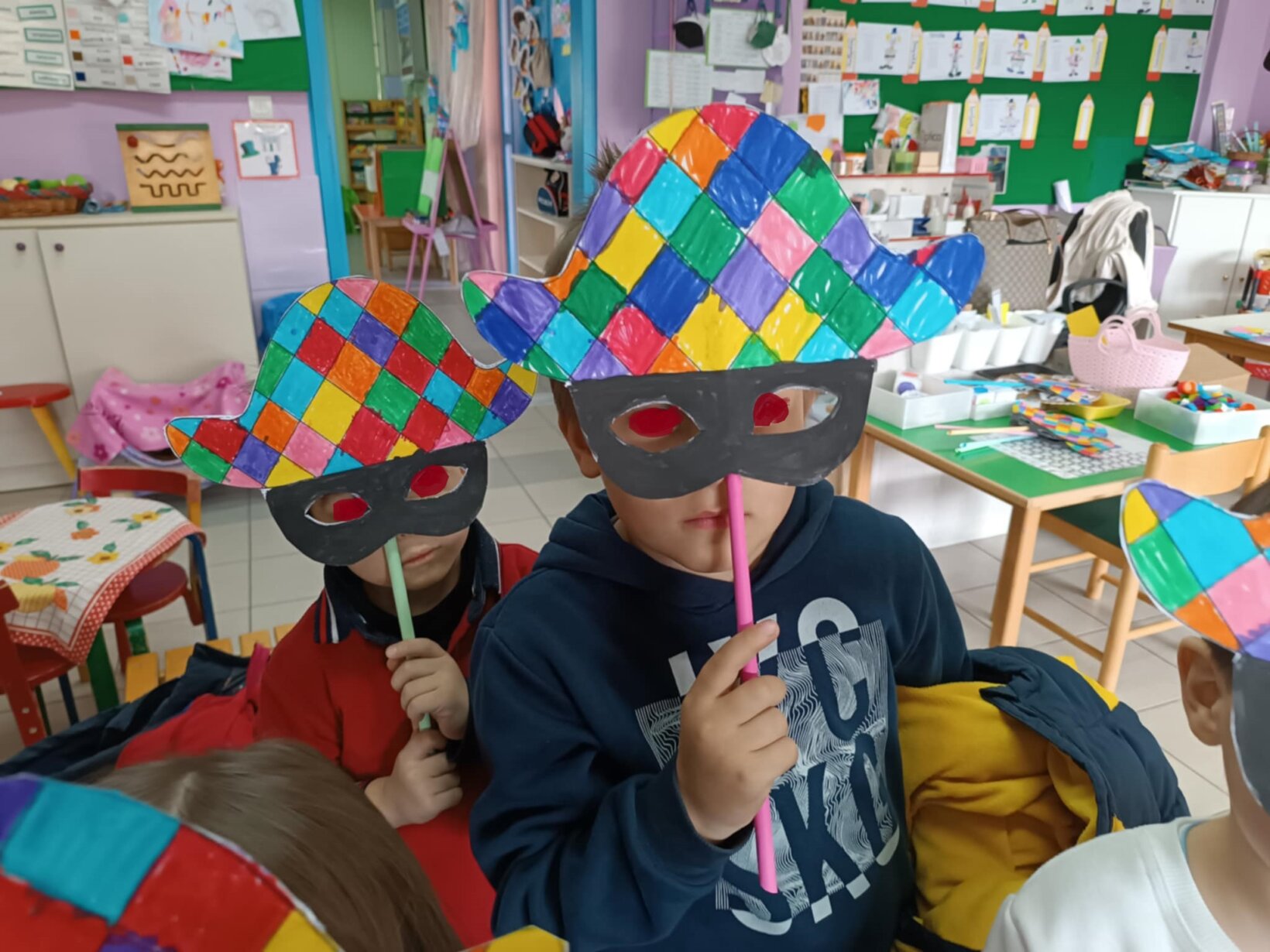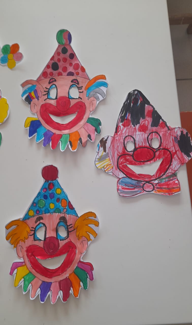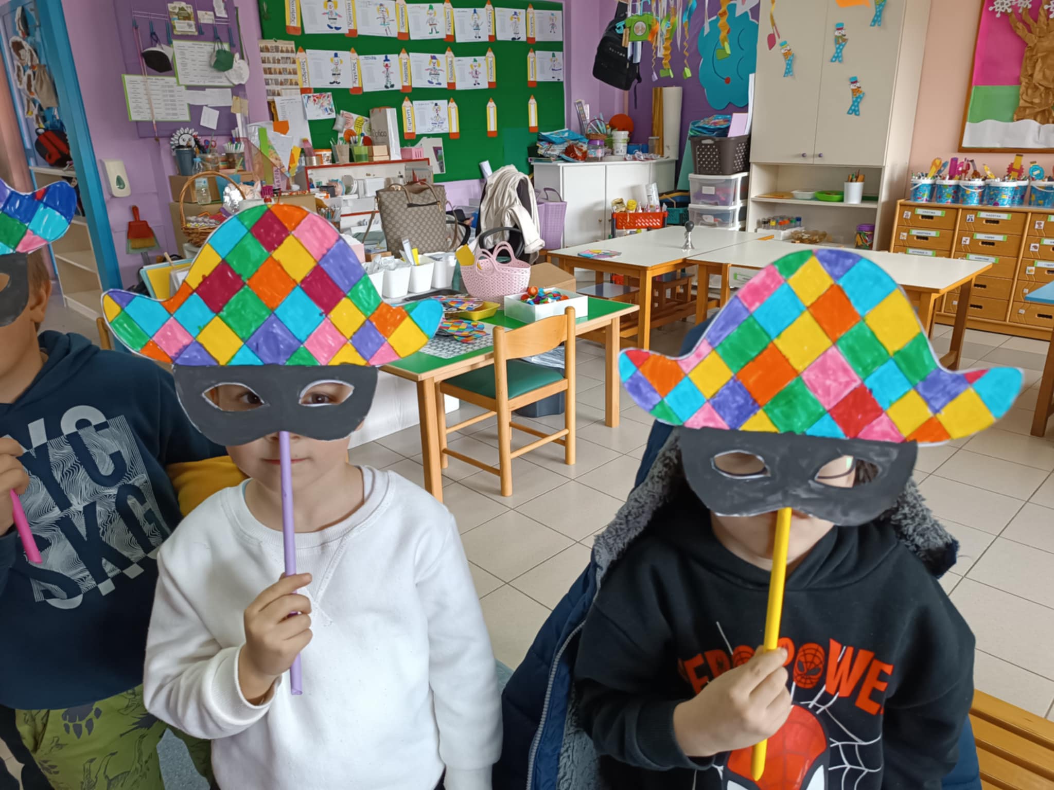 🎭 Μάσκες: Χρησιμοποιήσαμε χαρτόνι και διάφορα διακοσμητικά υλικά για να φτιάξουμε αποκριάτικες μάσκες. Κάθε παιδί δημιούργησε τη δική του μοναδική μάσκα και τη φόρεσε με καμάρι!