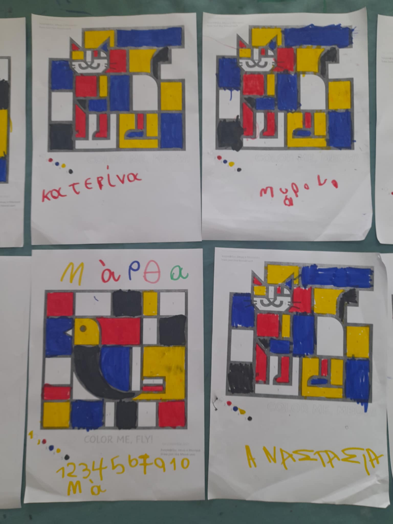 Στο νηπιαγωγείο γνωρίσαμε τον διάσημο ζωγράφο Πιτ Μοντριάν. Ο Μοντριάν αγαπούσε πολύ τις γραμμές, τα σχήματα και τα χρώματα. Στους πίνακές του χρησιμοποιούσε ευθείες μαύρες γραμμές και τετράγωνα ή ορθογώνια σχήματα που τα γέμιζε με έντονα χρώματα όπως κόκκινο, μπλε και κίτρινο.