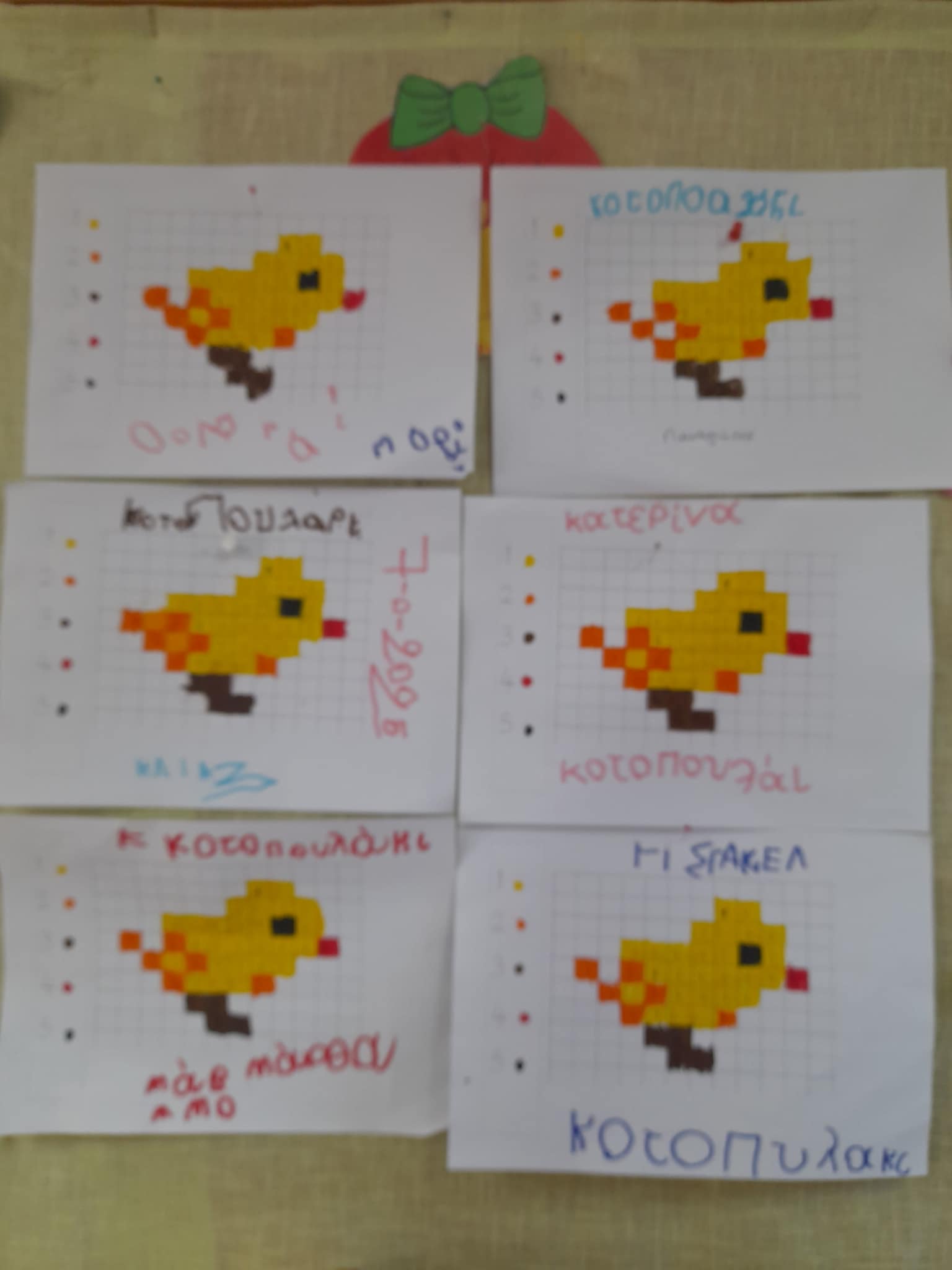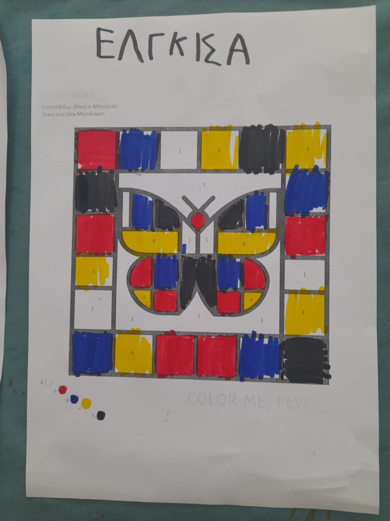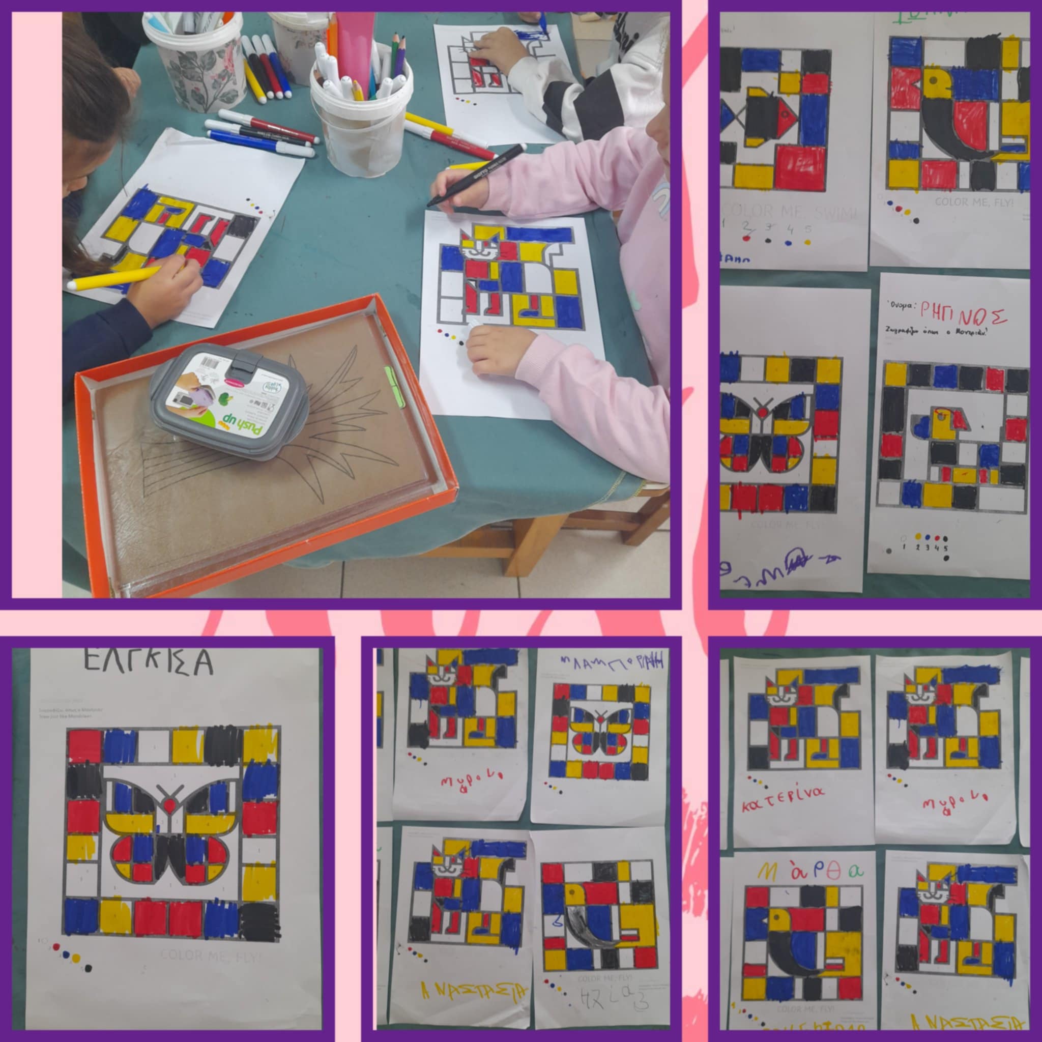Χρησιμοποιήσαμε γραμμές, σχήματα και χρώματα, δημιουργώντας έργα που θύμιζαν τους πίνακες του Μοντριάν. Με τις ζωγραφιές μας συμμετείχαμε σε ομάδα νηπιαγωγείων με το ίδιο θέμα για την εβδομάδα προγραμματισμού- Code Week 25. Ήταν μια δημιουργική και διασκεδαστική εμπειρία, όπου γίναμε κι εμείς μικροί καλλιτέχνες – προγραμματιστές!