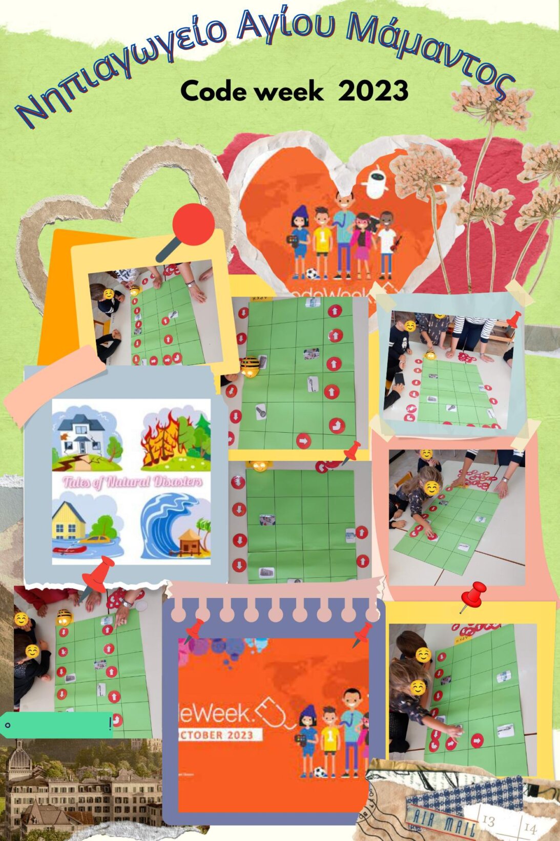 Φέτος το Νηπιαγωγείο μας παίρνει μέρος σε δύο διαφορετικές συμμαχίες για την Ευρωπαϊκή Εβδομάδα Κώδικα. Η πρώτη στα πλαίσια του Ευρωπαϊκού Προγράμματος Etwinnng “Tales of Natural Disasters”, τα παιδιά θα γνωρίσουν απλές διαδικασίες προγραμματισμού και θα ανταλλάξουν ιδέες με τα συνεργαζόμενα νηπιαγωγεία. Ενώ η δεύτερη με τίτλο “Coding and sustainability ” και οργανωμένη από το Νηπιαγωγείο Ριζαριού και την προϊσταμένη του κ. Μαγκιώση Άννα έχει ελεύθερο θέμα.