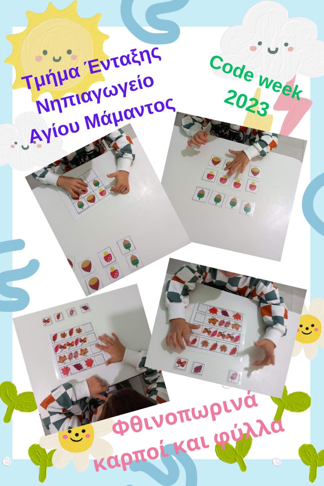 - “Ομαδοποίηση φθινοπωρινών φύλλων”.Το νήπιο αναγνωρίζει αρχικά τις εικόνες με τους ίδιους καρπούς, τους κατονομάζει και τους ομαδοποιεί (κώδικας)