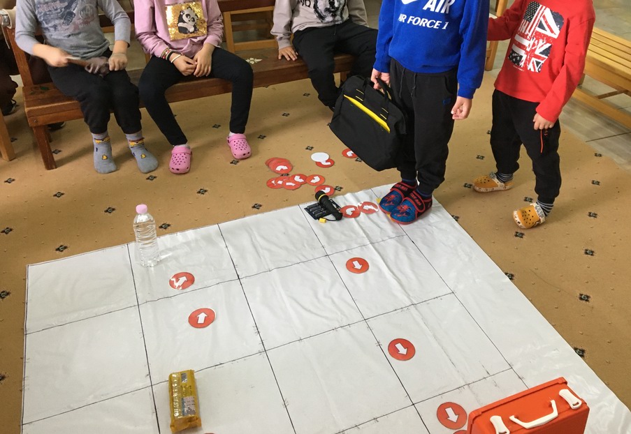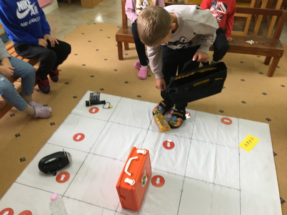 Τέλος ετοιμάζουμε την τσάντα εκτάκτων αναγκών!Μια τσάντα που όλοι μαζί αποφασίζουμε τι θα βάλουμε μέσα που είναι απαραίτητο σε μια έκτακτη ανάγκη όπως αυτή του σεισμού. Τα παιδιά αναφέρουν πολλά είδη φαρμακείου όπως βαμβάκι, Ιώδιο, οινόπνευμα, γάζες, τσιρότα, θερμόμετρο και πολλά άλλα. Μέσα στην τσάντα βάζουμε και ένα μεγάλο μπουκάλι νερού, έναν φακό, μια σφυρίχτρα, και ένα μικρό ραδιοφωνάκι,κράκερς, σύμφωνα με τις οδηγίες πολιτικής προστασίας του Ο.Α.Σ.Π.Αφού λοιπόν κάναμε όλη την παραπάνω προετοιμασία ήρθε η ώρα να παίξουμε…