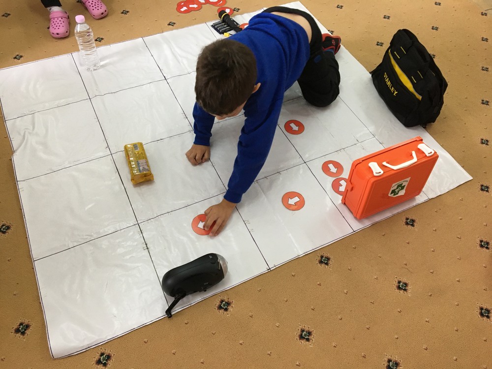 Αρχικά πάνω στο πλέγμα που φτιάξαμε ώστε να γίνουμε οι ίδιοι ρομπότ και προγραμματιστές!