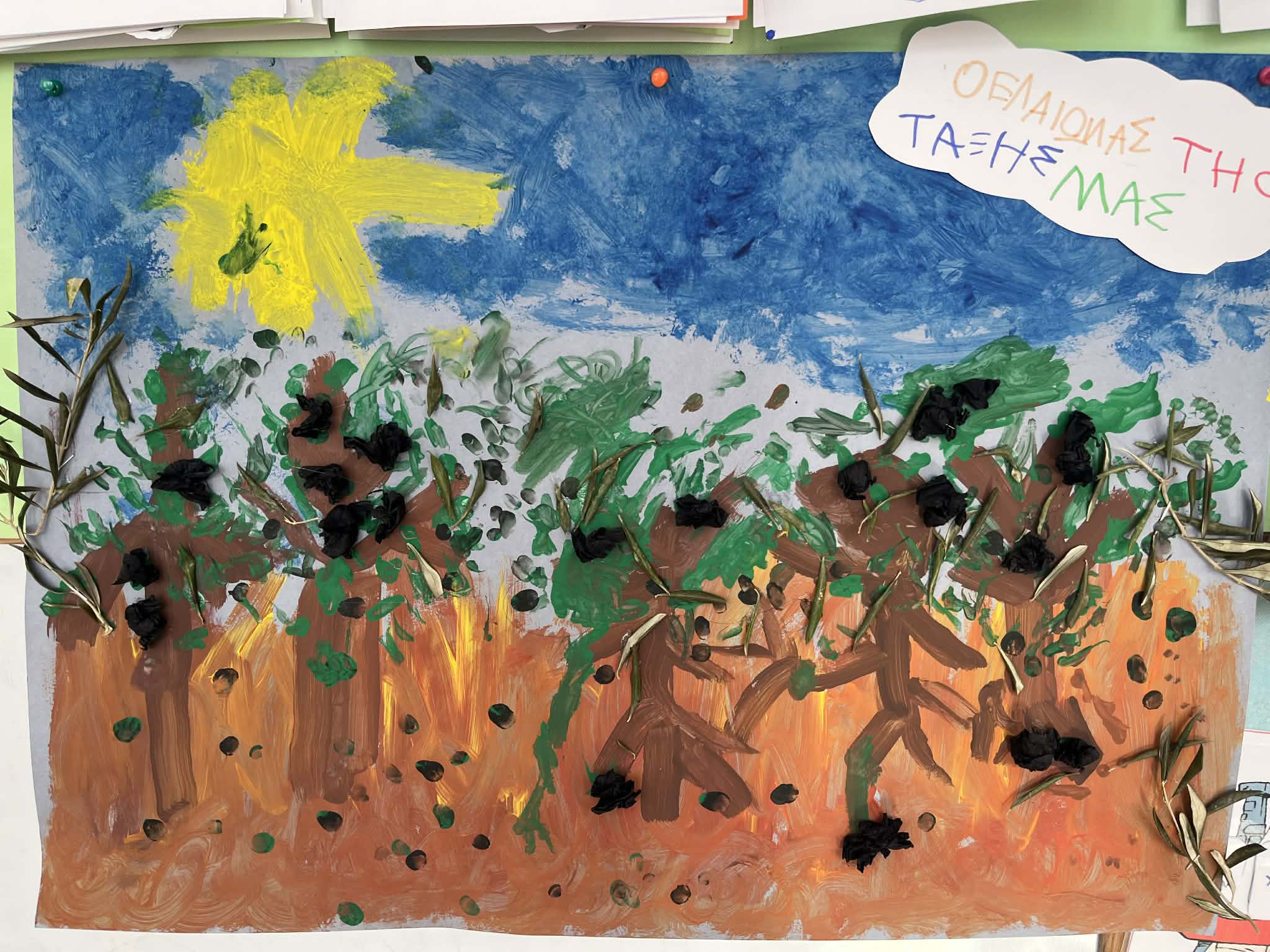 Φτιάξαμε όμορφες ομαδικές δημιουργίες με τέμπερες, φύλλα, κλαδάκια και καρπούς ελιάς. Τα παιδιά άγγιξαν, μύρισαν και παρατήρησαν από κοντά τους καρπούς, τα φύλλα και το ξύλο, και ενθουσιάστηκαν με τα χρώματα και τις υφές.