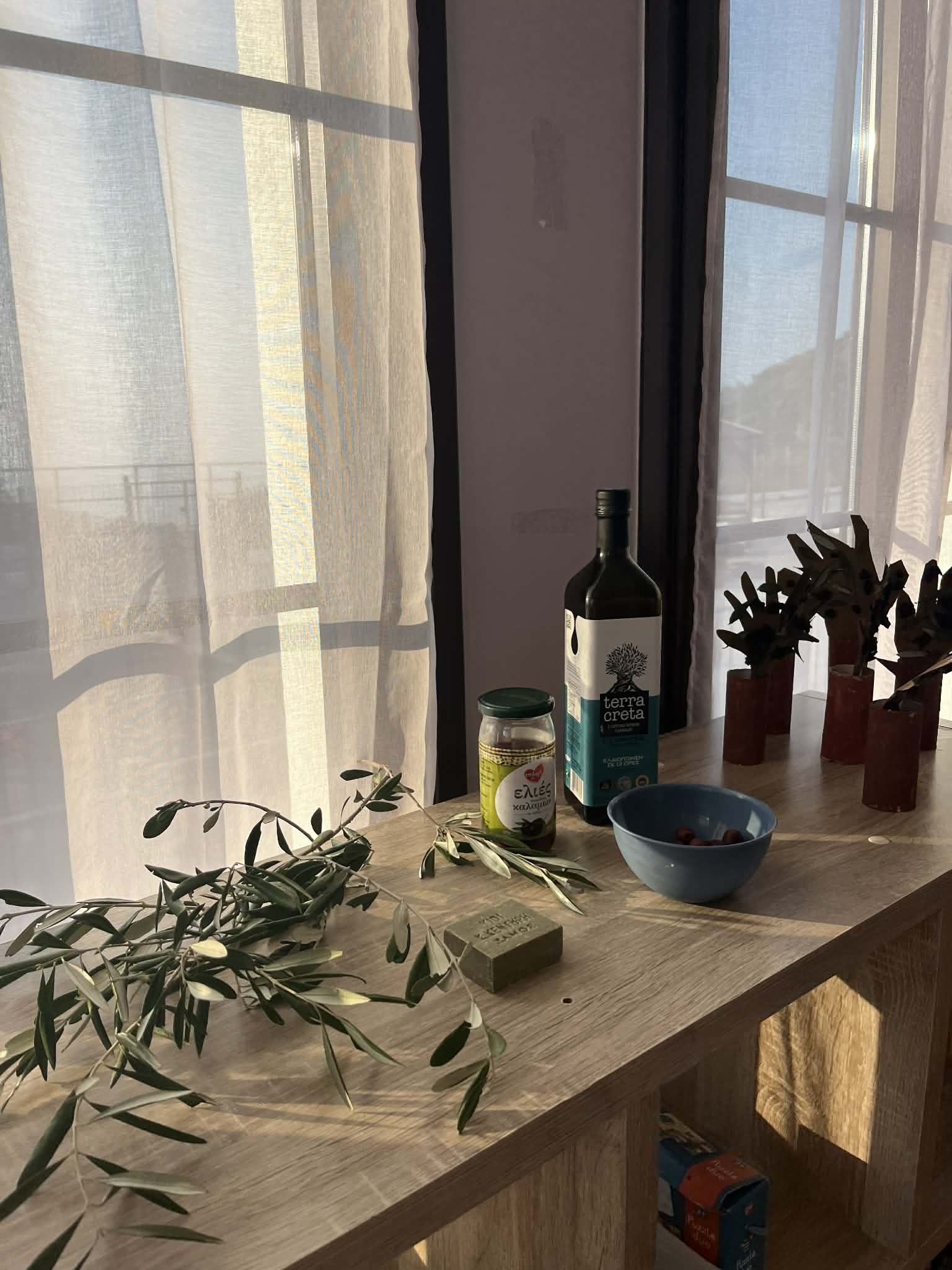 Παρατηρήσαμε από κοντά ελιές, φύλλα, λαδάκι και σαπούνι ελιάς. Συγκρίναμε μυρωδιές, χρώματα και υλικά, και τα παιδιά σχολίασαν με τον δικό τους αυθόρμητο τρόπο τις διαφορές.