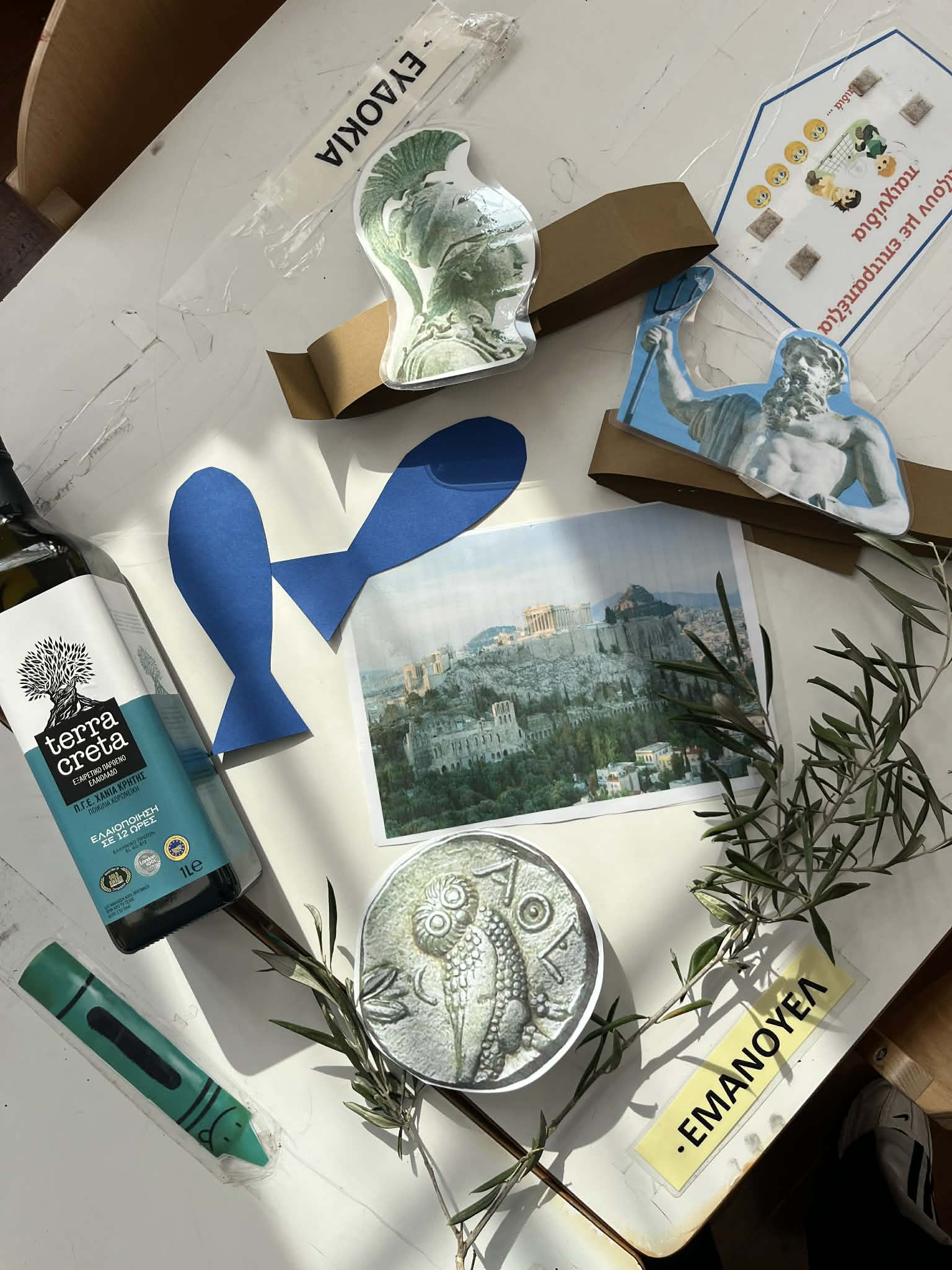 Ακούσαμε τον μύθο της θεάς Αθηνάς και του δώρου της — της ελιάς. Τα παιδιά τον δραματοποίησαν, γελώντας και μπαίνοντας στους ρόλους των θεών που παρακολουθούσαν τον διαγωνισμό.