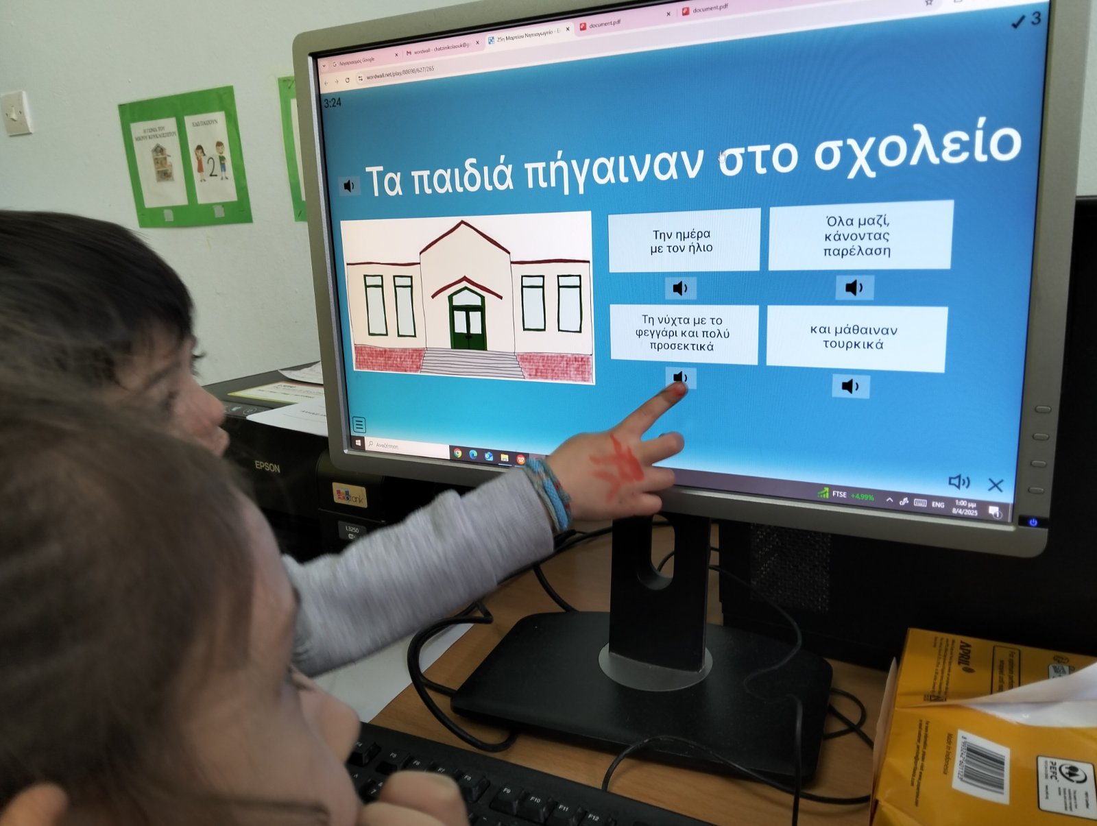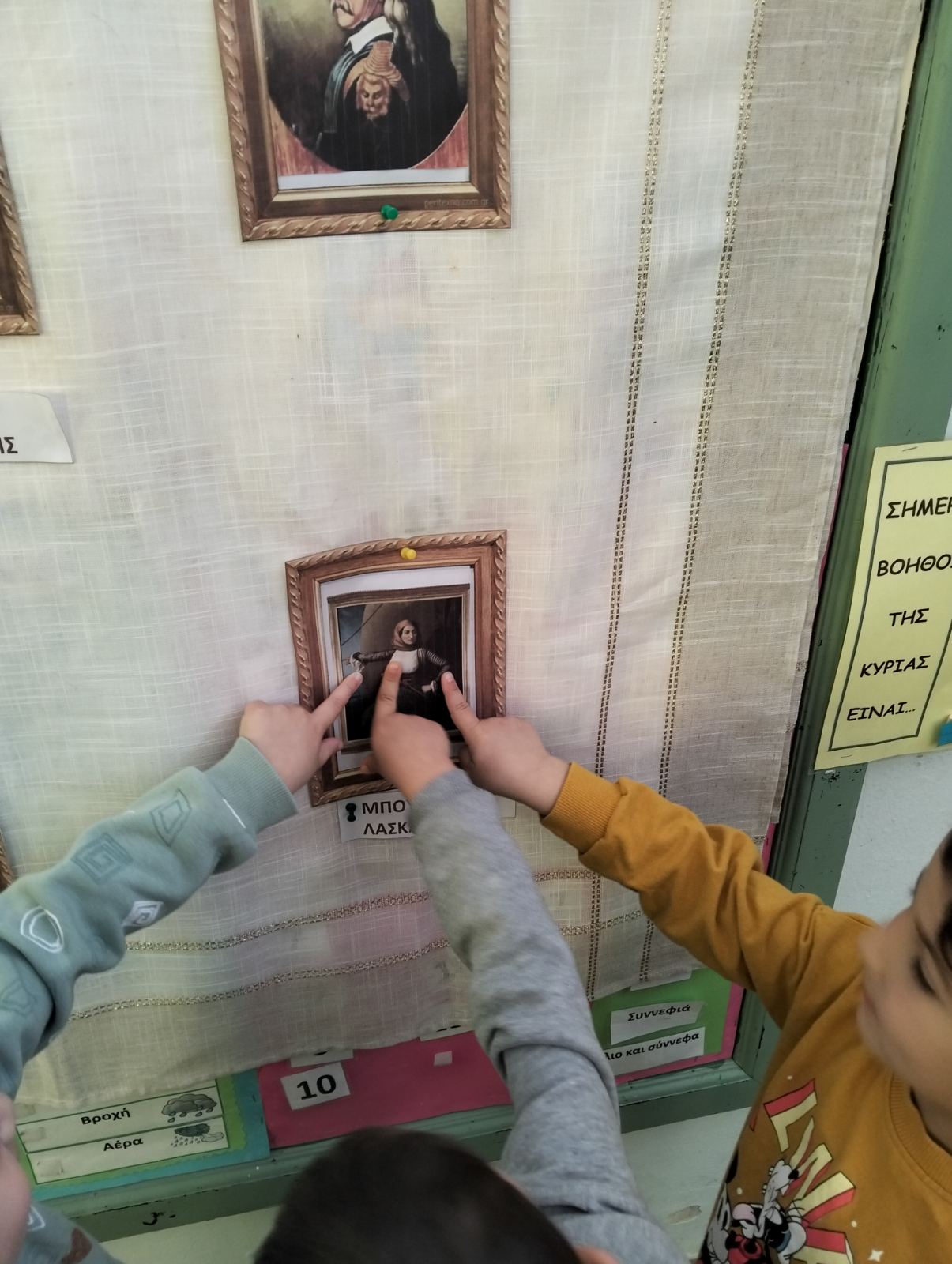 Τα παιδιά με τη βοήθεια του υπολογιστή και δείχνοντας εικόνες ηρώων βοηθούν το