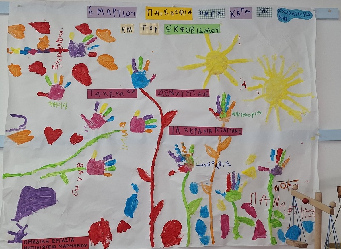 Με αφορμή την “Παγκόσμια Ευρωπαϊκή Ημέρα Γλωσσών”, οι εκπαιδευτικοί του Νηπιαγωγείου Μαρμαρίου διοργάνωσαν αντίστοιχες δραστηριότητες μαζί με τα παιδιά. Στο πλαίσιο του μαθήματος των Αγγλικών, οι μαθητές είδαν και αναγνώρισαν σημαίες από διάφορες χώρες και έμαθαν την λέξη “γεια” στην αντίστοιχη γλώσσα. Τέλος, τραγούδησαν και συνεργάστηκαν, δημιουργώντας ένα κολλάζ από σημαίες.