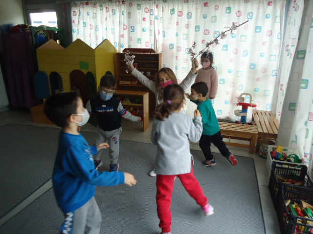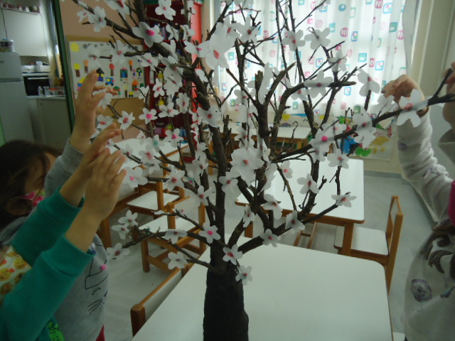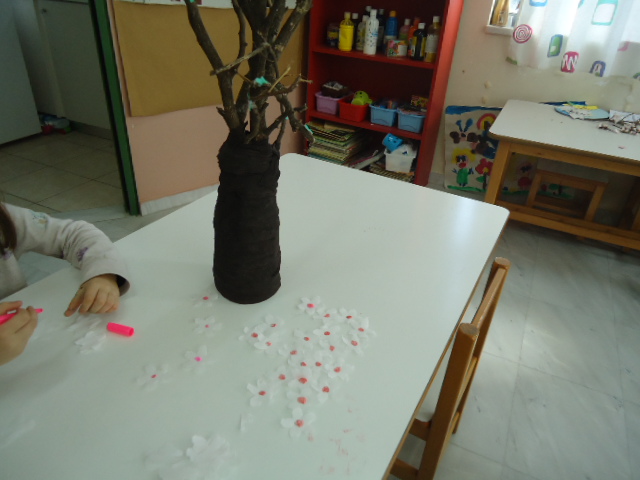 Παρατηρήσαμε τα κλαδιά και αποφασίσαμε να φτιάξουμε τη δική μας μυγδαλιά να στολίζει το σχολείο. Κόψαμε κλαδιά φυσικά, τα στερεώσαμε κι έπειτα μικρά λουλουδάκια από άσπρο γκοφρέ και τα κολλήσαμε (αφού βάλαμε και λίγο ροζ στα ανθάκια)