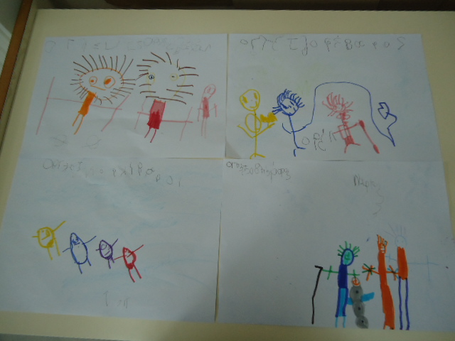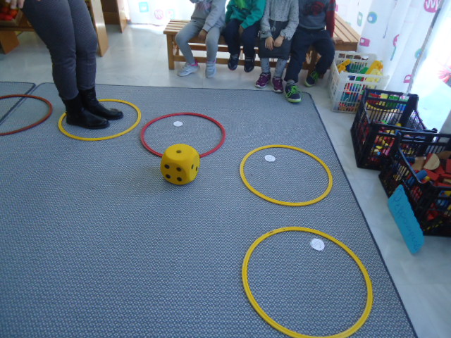 Παίξαμε με το ζάρι και τα στεφάνια…σε κάθε στεφάνι ένα γράμμα…ρίχνουν το ζάρι …περπατάνε τόσα βήματα όσα λέει ο αριθμός και ανάλογα σε ποιό γράμμα σταματήσουν σκέφτονται και λένε λέξεις που αρχίζουν από το συγκεκριμένο γράμμα