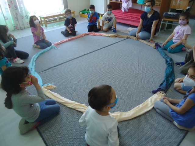 Σε κύκλο που έχει σχηματιστεί με χρωματιστά υφάσματα περπατάνε τα παιδιά με μουσική υπόκρουση. Όταν η μουσική σταματά κάθονται σε σχήμα κύκλου και στη συνέχεια ο καθένας παρουσιάζεται στην ομάδα μιλώντας για τον εαυτό του και επικεντρώνοντας στα θετικά και αρνητικά του χαρακτήρα και της συμπεριφοράς του. Παρατηρούμε ότι όλοι έχουμε ομοιότητες και διαφορές αλλά έχουμε ένα κοινό στοιχείο ότι είμαστε παιδιά με διάθεση για παιχνίδι και δραστηριότητες