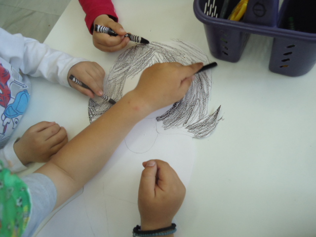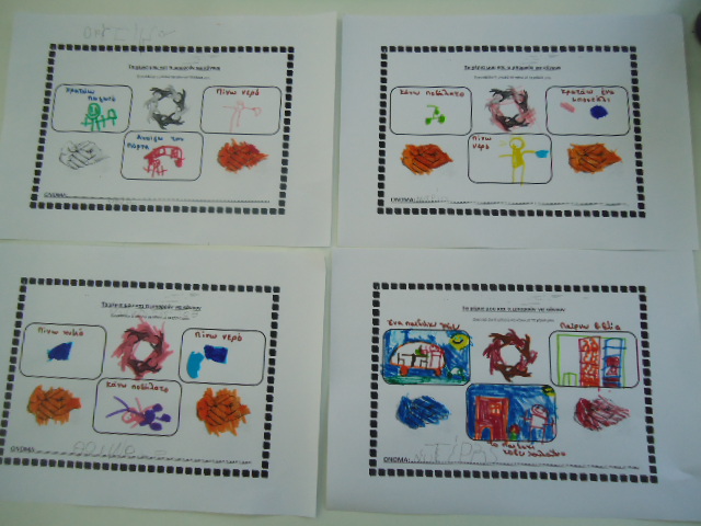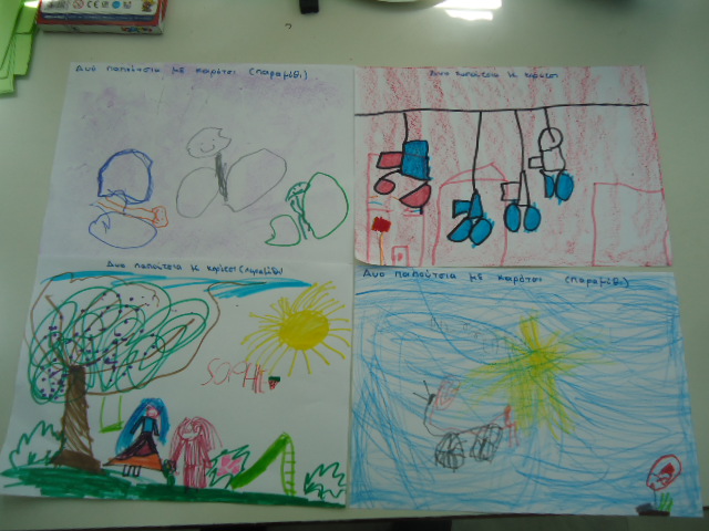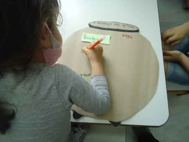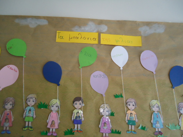 Δραματοποίηση της ιστορίας και ομαδική κατασκευή με μπαλόνια από χαρτόνι που πάνω έγραψαν λέξεις ευγενικές που έχουν σχέση με τη φιλία