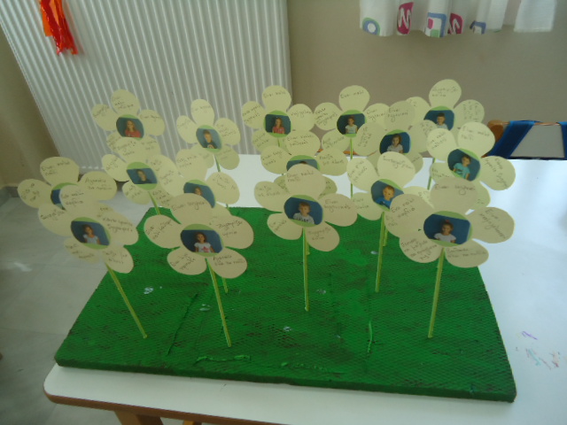 Κατασκευή μαργαρίτας με 5 πέταλα με τη φωτογραφία του παιδιού στη μέση .Στα 4 πέταλα γράφουμε τα θετικά στοιχεία που βρίσκει το παιδί στον εαυτό του και στο 5ο γράφουμε ένα αρνητικό. Δημιουργούμε μία τρισδιάστατη κατασκευή μαργαρίτες στο λιβάδι. Φαίνονται τόσο ίδιες αλλά στην πραγματικότητα είναι τόσο διαφορετικές!!