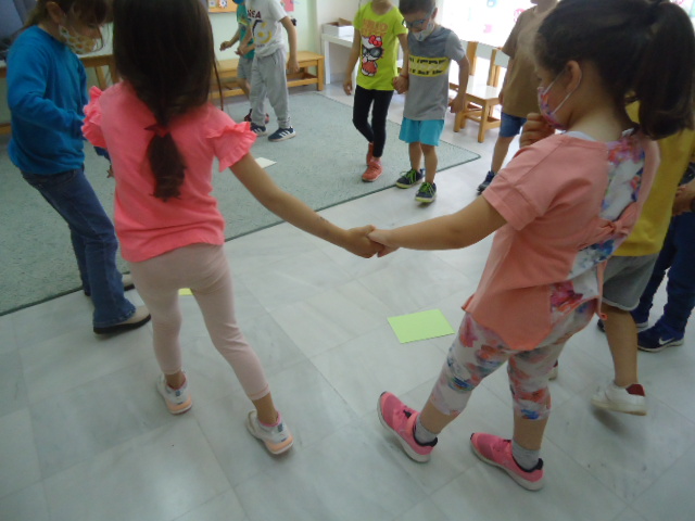 Παιχνίδια συνεργασίας στην ομάδα. Ο ιστός της αράχνης με ένα κουβάρι νήμα. Παιχνίδια με την μπάλα. Ο καθένας δίνει την μπάλα στον διπλανό και όποιος την κρατούσε έλεγε διάφορα πράγματα γιαυτό πχ ποιο είναι το αγαπημένο του φαγητό, το αγαπημένο του χρώμα κλπ
