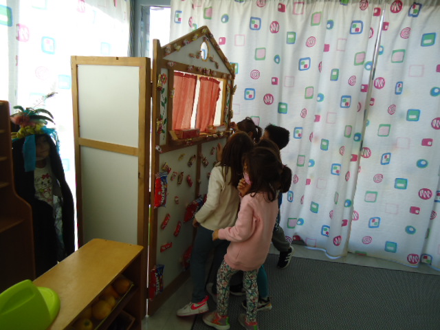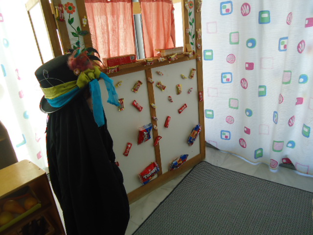 Φτιάξαμε το ζαχαρόσπιτο της μάγισσας αφού διαμορφώσαμε κατάλληλα το κουκλοθέατρο κολλώντας πάνω διάφορα γλυκίσματα