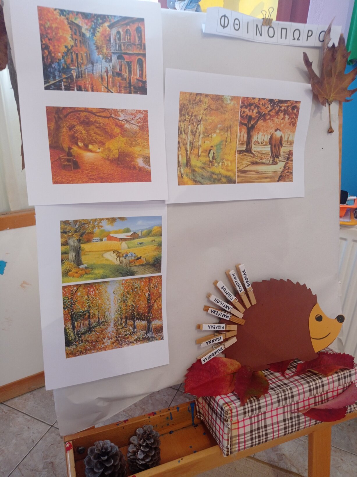 Ακολούθησαν ασκήσεις φωνολογικής ενημερότητας: α)Λέγοντας την λέξη ”ΦΘΙΝΟΠΩΡΟ” χτυπάμε τόσα παλαμάκια όσο είναι οι συλλαβές της λέξεις (ΦΘΙ-ΝΟ-ΠΩ-ΡΟ), β) προφορικά αναγνωρίζουμε και λέμε δυνατά τις φωνούλες της λέξης (Φ, Θ,Ι, Ν, Ω, Π,Ο,Ρ,Ο) . Έπειτα τα παιδιά αντιγράφουν την λέξη και κόβουν και κολλάνε τις φωνούλες στο σωστό κουτάκι.