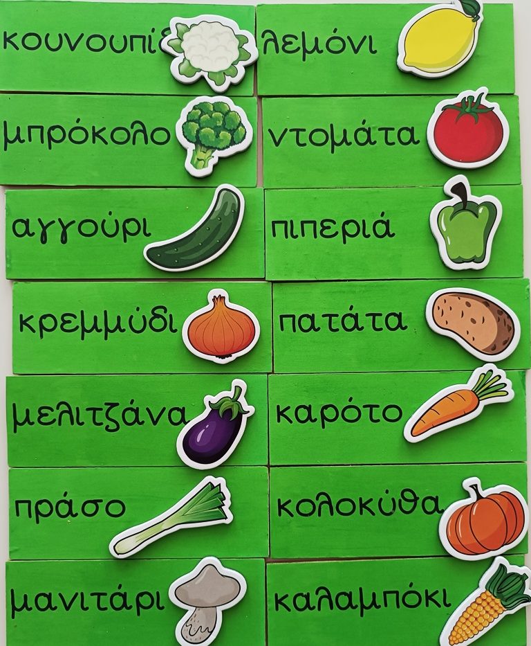 - Αξιοποιήσαμε παλιές, φθαρμένες ξύλινες ταμπλέτες. Αγοράσαμε μαγνητάκια με ζώα, λαχανικά και φρούτα, πληκτρολογήσαμε τις αντίστοιχες λέξεις. Κατά τη διάρκεια της χρονιάς επιλέγουμε τις λέξεις που ταιριάζουν στην εποχή και τα παιδια κάνουν τις αντιστοιχίσεις λέξης-εικόνας.