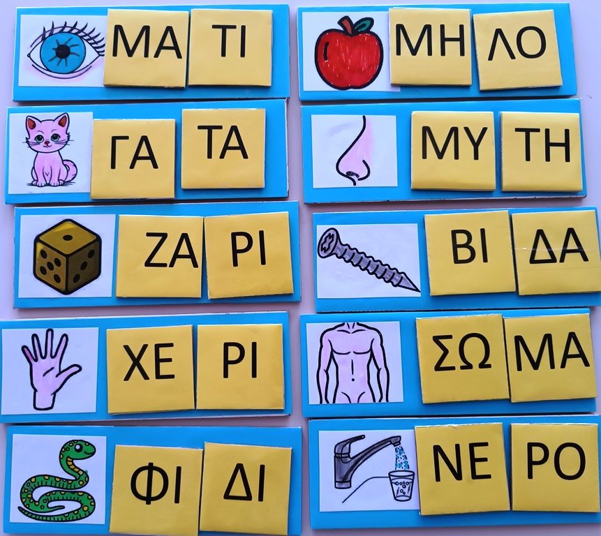 - Φτιάξαμε έναν πίνακα διπλής εισόδου με τις συλλαβές. Βρήκαμε λέξεις που ξεκινούν πχ από πα, πε, πι, πο, που…. και βρήκαμε αντίστοιχες εικόνες. Σε δυο ζάρια βάλαμε τα συμφωνα και τα φωνήεντα. Τα παιδιά ρίχνουν τα ζάριακαι από τον συνδυσμό που βγαίνει αναζητούν την αντίστοιχη συλλαβή.