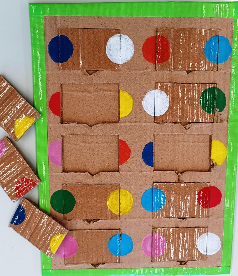 - Με δύο χαρτόνια από χαρτόκουτα φτιάξαμε ένα παιχνίδι αντιστοίχισης με τα χρώματα. (γωνιά παζλ)