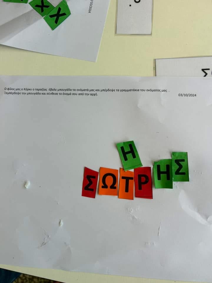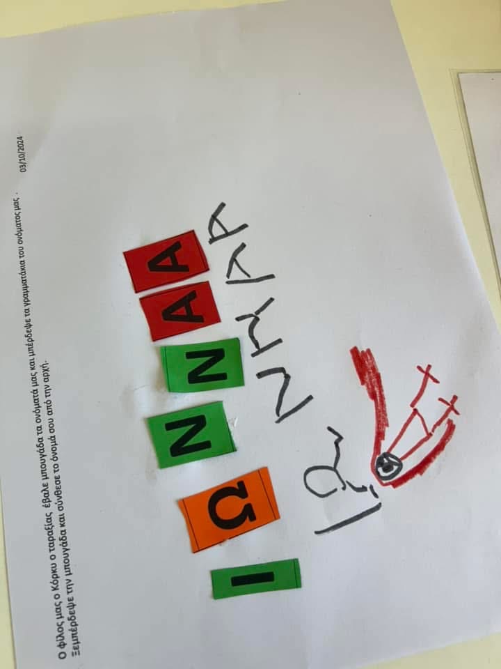 Ο φίλος μας, ο Λάκης ο Δεινοσαυράκης, σήμερα ήταν πολύ λυπημένος!!!Έχασε το αρχικό του γράμμα και απο Λάκης εγινε… Άκης!!!!Του είπαμε ότι θα τον βοηθησουμε να το βρει για να μην νιώθει πια λυπημένος. Του προτείναμε μάλιστα και νέα όνοματα. Του δωσαμε το Μ και έγινε Μάκης, το Σ και έγινε Σάκης, το Τ και έγινε Τάκης κλπ., αλλά δεν του αρέσαν καθόλου τα νεα του ονόματα. Χάσαμε κ εμείς το δικό μας κ του συστηθηκαμε δίχως αυτό, για να νιώσει καλύτερα. Εντέλει βρήκαμε το αρχικο του κ απο Άκης έγινε ξανά Λάκης.Στην συνέχεια ανακαλύψαμε κ το δικό μας αρχικό ψαρεύοντας σε μια λεκάνη με την κουτάλα, δημιουργήσαμε μικρές ομαδούλες με τα ίδια αρχικά κ τελος φτιάξαμε κ το ατομικό μας ρολογάκι με το μονόγραμμα μας
