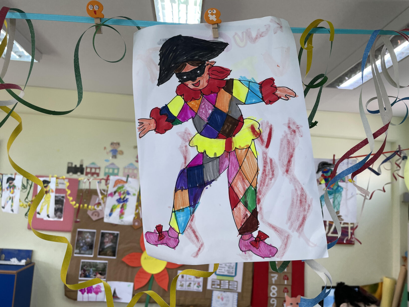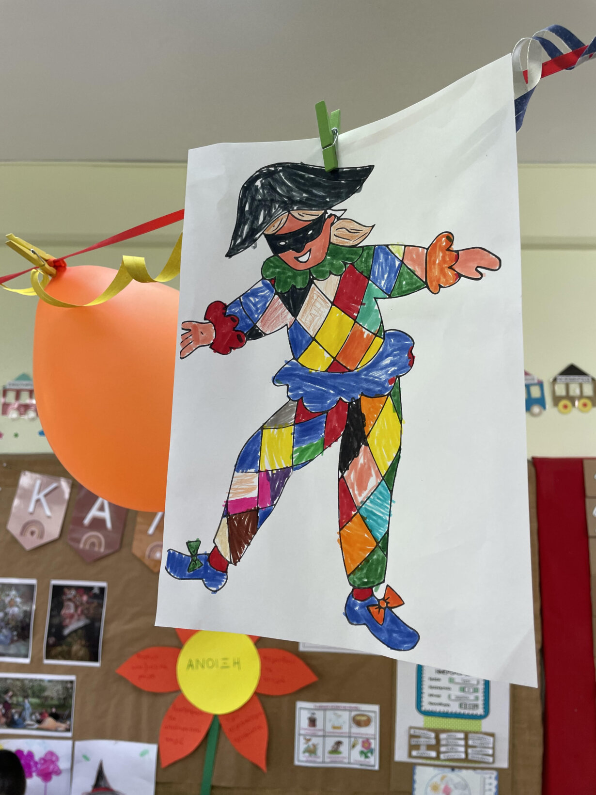 Διαβάσαμε το παραμύθι ” Ο Αρλεκίνος” της Ζωρζ Σαρή. Παρατηρήσαμε τη στολή του Αρλεκίνου και μιλήσαμε για το σχήμα ρόμβο. Στη συνέχεια είδαμε και συζητήσαμε για τους πίνακες με τους αρλεκίνους του Πάμπλο Πικάσο. Αποφασίσαμε να φτιάξουμε και εμείς έναν από τους πίνακές του.
