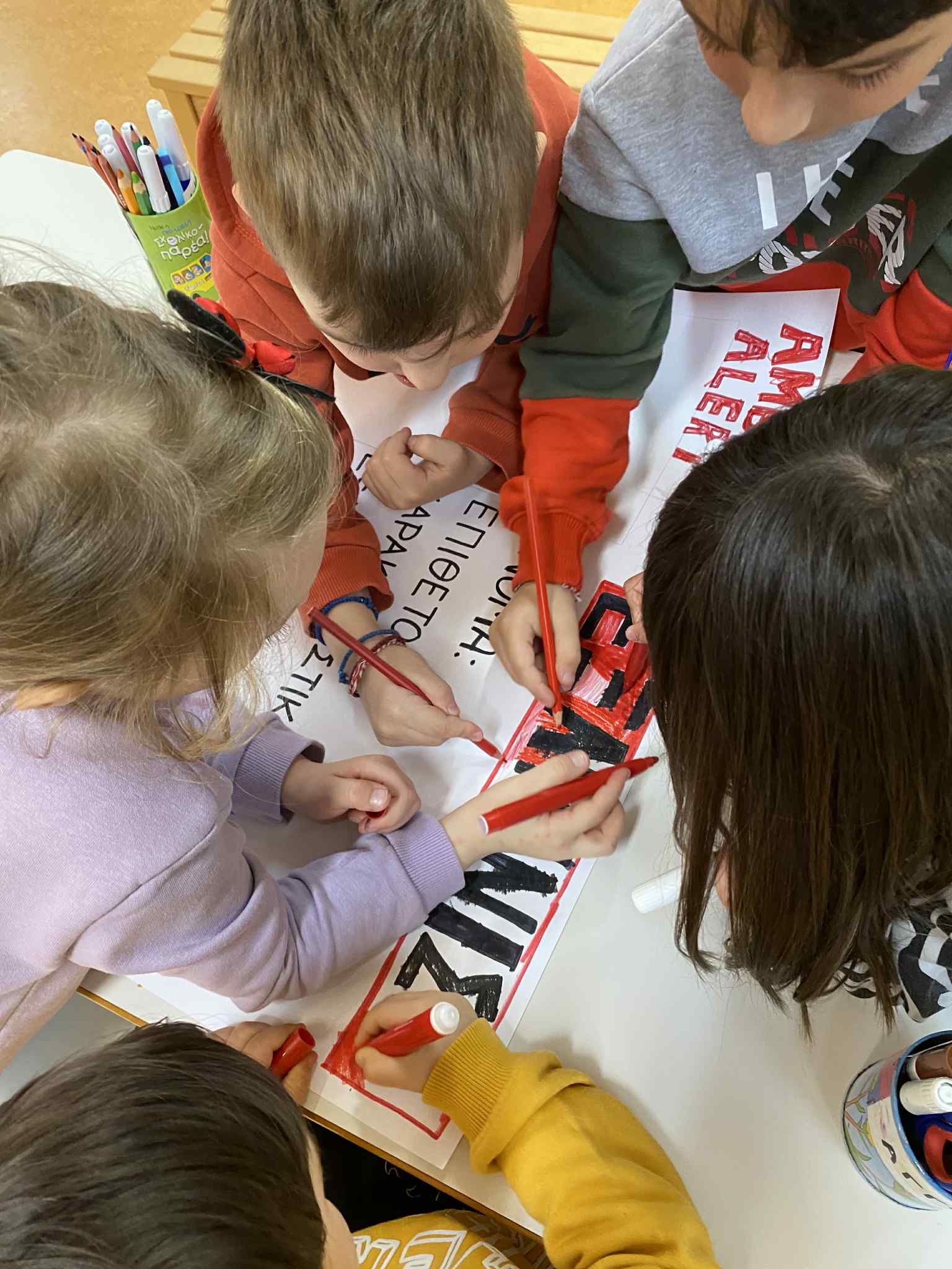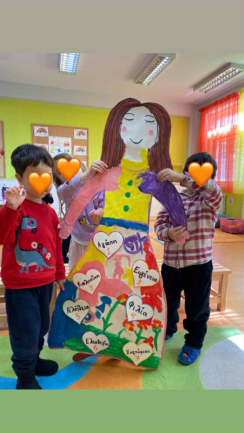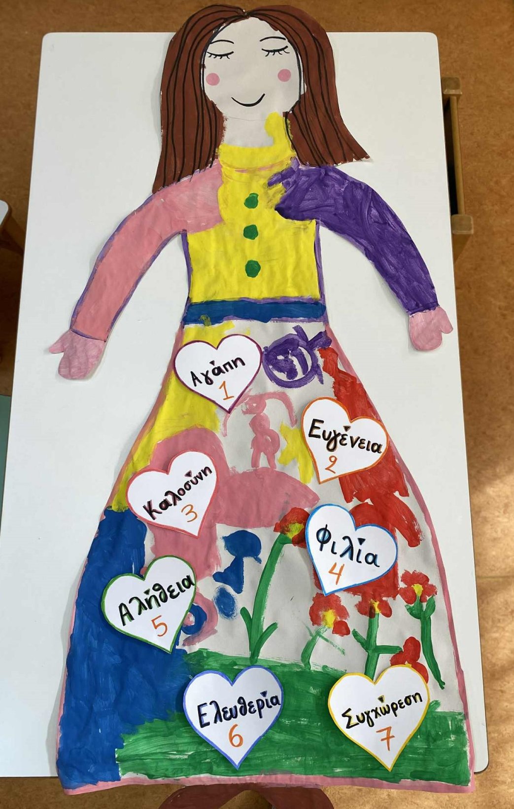 Τα παιδιά δημιούργησαν κατασκευές με μηνύματα αγάπης, φιλίας και αποδοχής, τραγούδησαν τραγούδια με θεματολογία τη φιλία και τη διαφορετικότητα και δημιούργησαν στη τάξη τη «Γωνιά της φιλίας». Μια γωνιά η οποία έχει στόχο να ενισχύσει την κοινωνική αλληλεπίδραση, τη συναισθηματική ανάπτυξη και την επίλυση συγκρούσεων μεταξύ των παιδιών. Είναι ένα μέρος όπου τα παιδιά ενθαρρύνονται να μιλήσουν, να συνεργαστούν και να λύσουν τυχόν διαφορές με ήρεμο και δημιουργικό τρόπο. Στο δικό μας το σχολείο λέμε “ΝΑΙ στη ΦΙΛΙΑ, ΟΧΙ στη ΒΙΑ”.