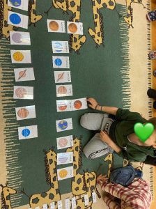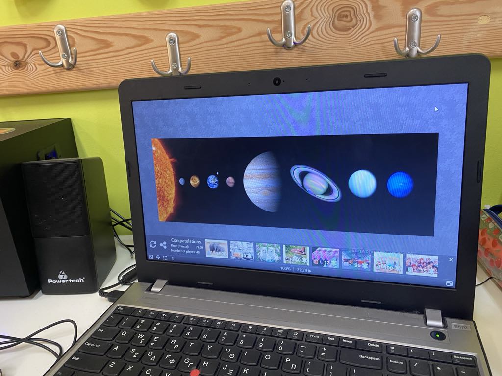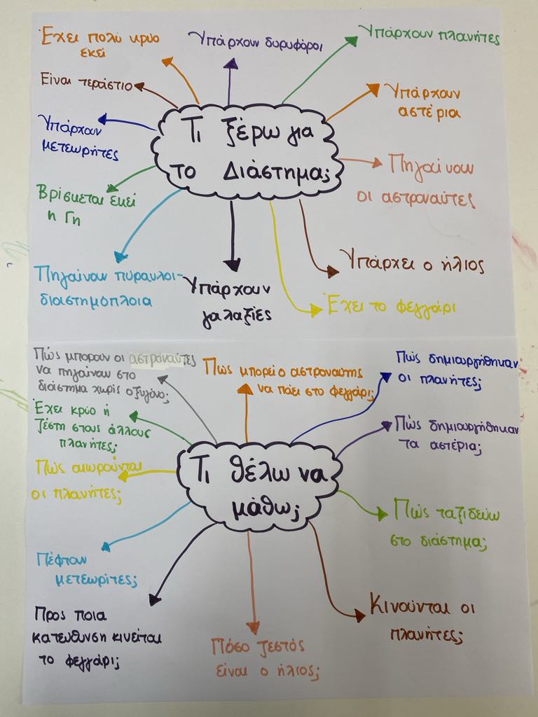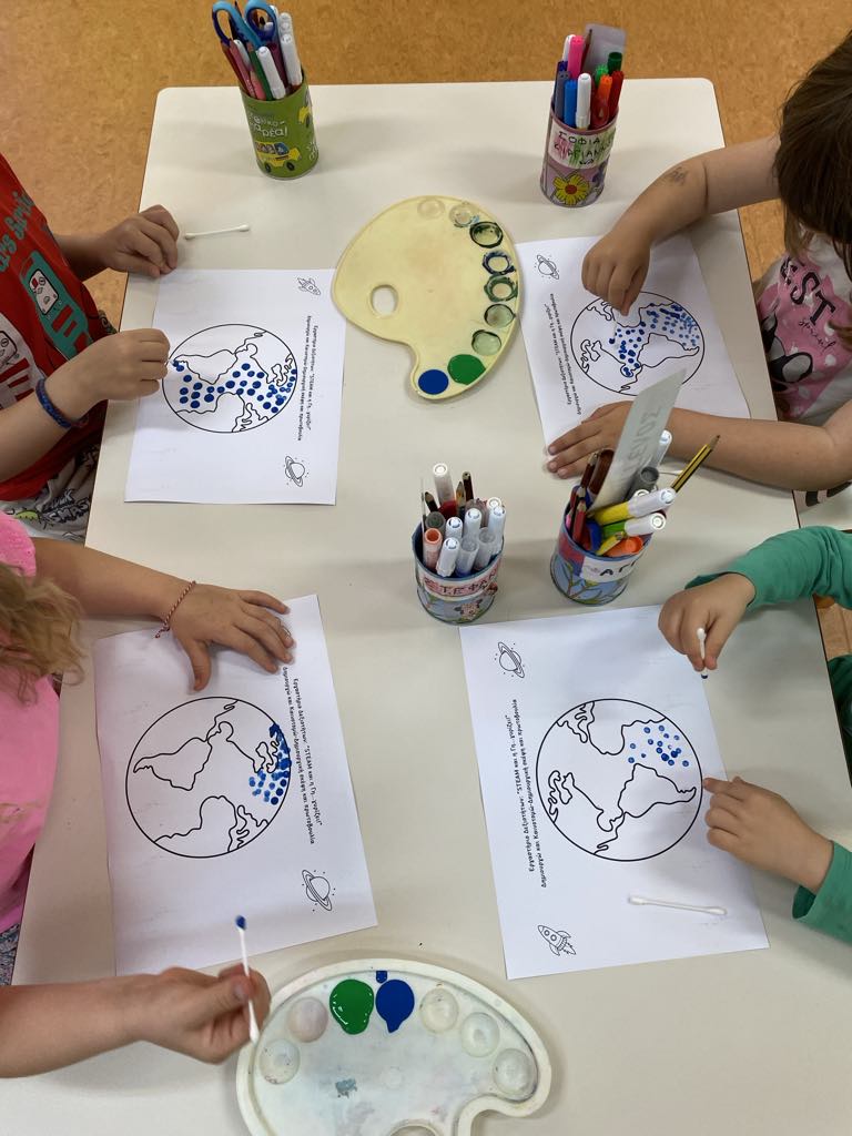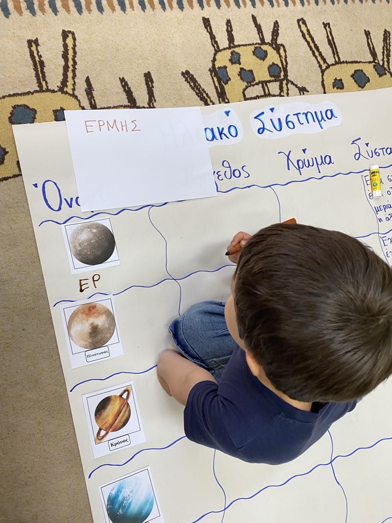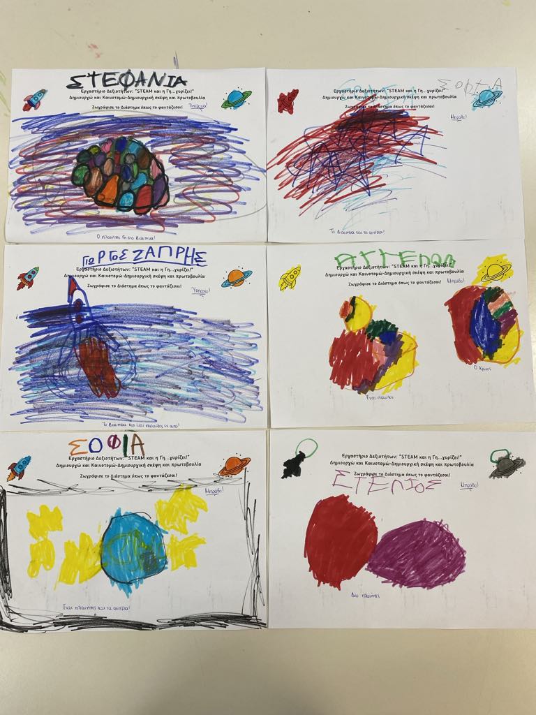 Τα παιδιά στο συγκεκριμένο Εργαστήριο Δεξιοτήτων ανακάλυψαν κάθε πλανήτη του ηλιακού μας συστήματος ξεχωριστά, έμαθαν για τα χαρακτηριστικά του και στη συνέχεια μίλησαν για τον πλανήτη Γη. Πώς είναι η Γη και τι υπάρχει σ’ αυτήν; Είναι στρογγυλή – σφαιρική, έχει πράσινο και μπλε χρώμα (το μπλε το οποίο είναι και περισσότερο συμβολίζει τη θάλασσα και το πράσινο τη στεριά) και σ’ αυτήν υπάρχουν, άνθρωποι, ζωάκια, ψαράκια, πουλιά, δέντρα, φυτά, σπίτια, σχολεία, παιδικές χαρές, αυτοκίνητα.. Μίλησαν για φυσικά φαινόμενα (κίνηση του πλανήτη Γη, εναλλαγή μέρας- νύχτας και εποχών) και πραγματοποίησαν πειράματα.