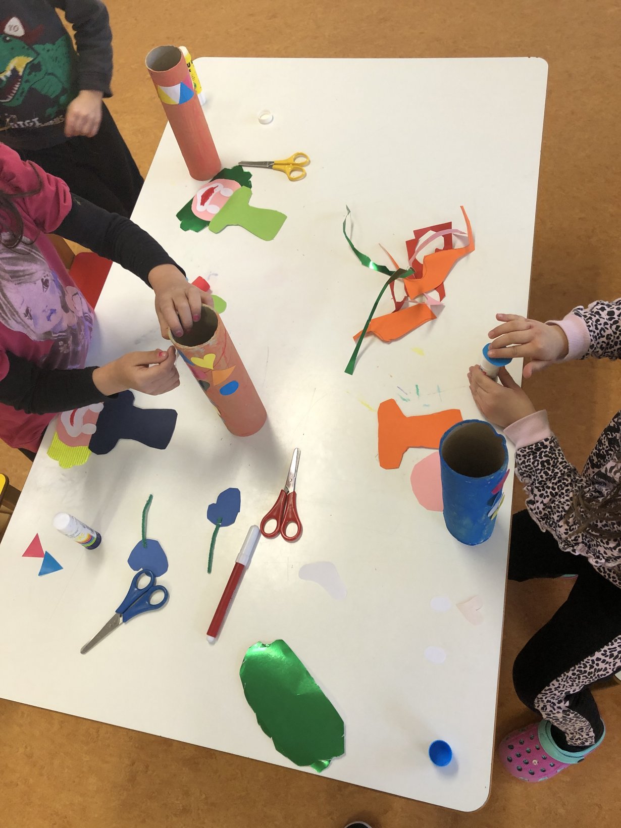 Ξεκινήσαμε την ενότητα μιλώντας για τα σχήματα που ξέρουμε. Ποιες οι διαφορές τους; Ποια τα κοινά τους; Ίδια σχήματα μπορεί να έχουν διαφορές, στο χρώμα, στο μέγεθος; Φτιάξαμε τα γεωμετρικά σχήματα με γλωσσοπίεστρα.