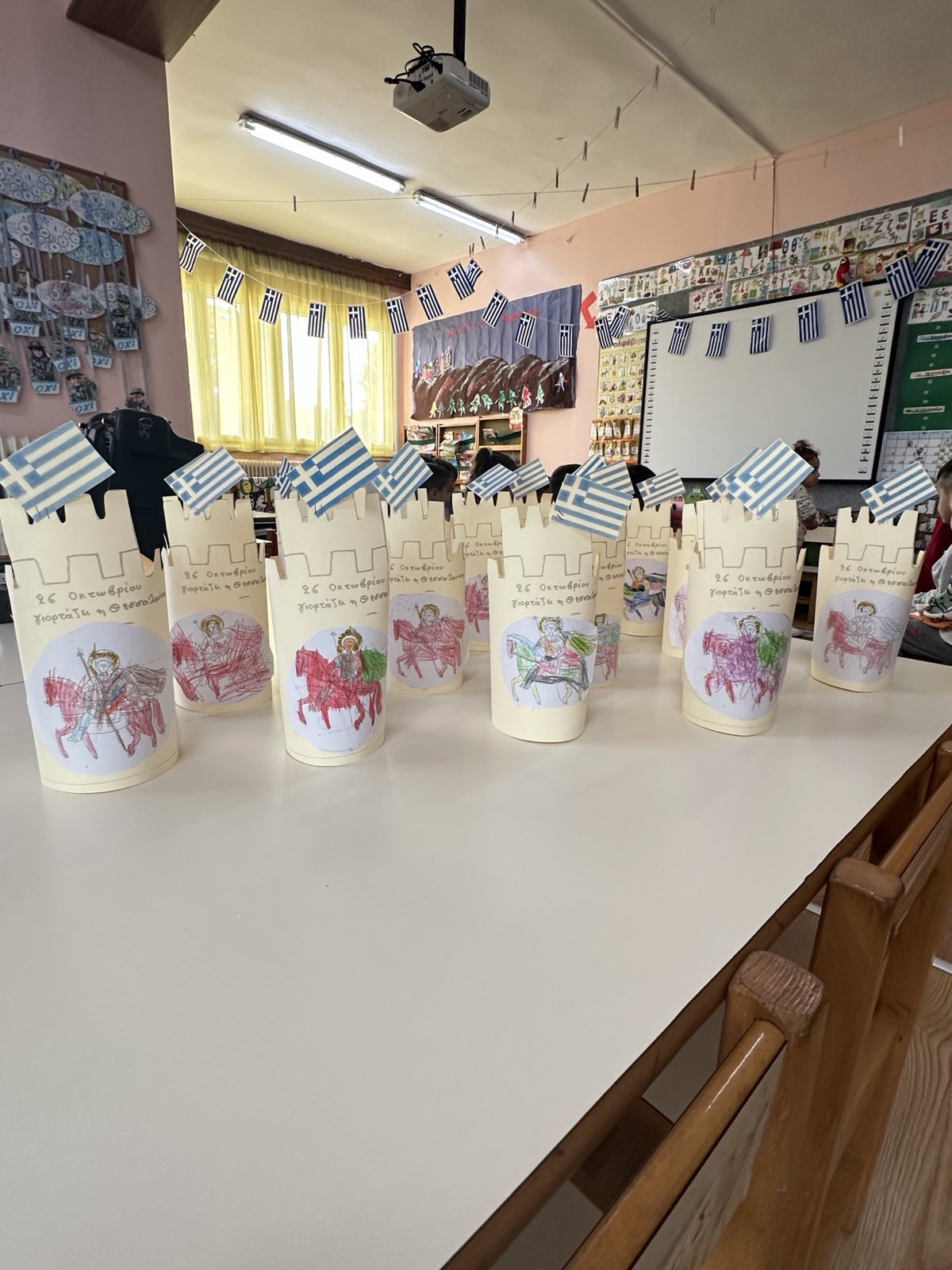 Μέσα απο σχετικές εικόνες και βιβλία συζητήσαμε στην τάξη μας για τα ιστορικά γεγονότα της 28ης Οκτωβρίου 1940, αναφερθήκαμε στο μεγάλο”ΟΧΙ” των Ελλήνων απέναντι στους Ιταλούς και προσπαθήσαμε να αιτιολογήσουμε τους λόγους αυτού του πολέμου…γράψαμε φύλλα εργασίας ,φτιάξαμε ομαδικη κατασκευή την ελληνική σημαία και αντιγράψαμε τη λέξη ”ΟΧΙ” φτιάχνοντας στεφάνι απο κανσόν…τέλος, μιλήσαμε για τον Βίο του Αγίου Δημητρίου , τον πολιούχο της Θεσσαλονίκης μας, και φτιάξαμε σχετική κατασκευή…λέγοντας ΟΧΙ στον πόλεμο , ΝΑΙ στην ΕΙΡΗΝΗ…!!