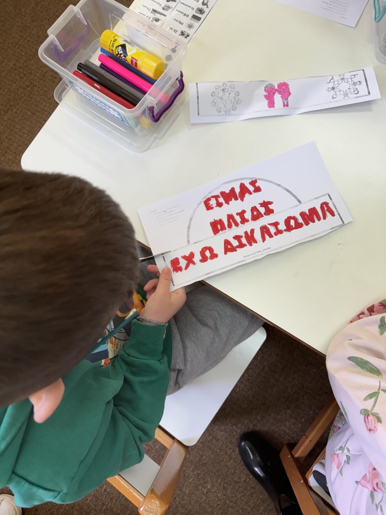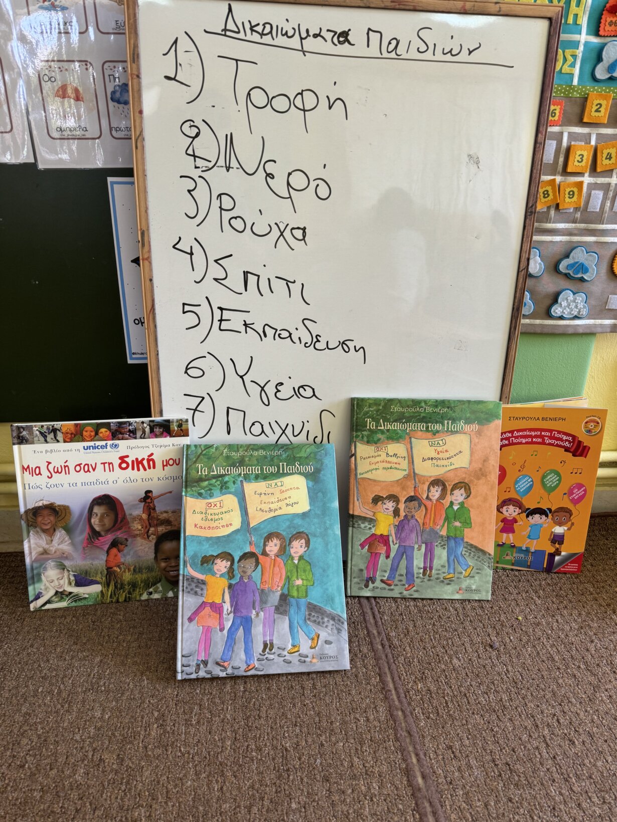 Αφού κατέγραψα στον πίνακα τα δικαιώματα που σκέφτηκαν τα παιδιά, τα διαβάσαμε ενδελεχώς μέσα από ιστορίες και τα επιβεβαιώσαμε από το βιβλίο της Σταυρούλας Βενιέρη “Κάθε Δικαίωμα και Ποίημα, Κάθε ποίημα και Τραγούδι”!