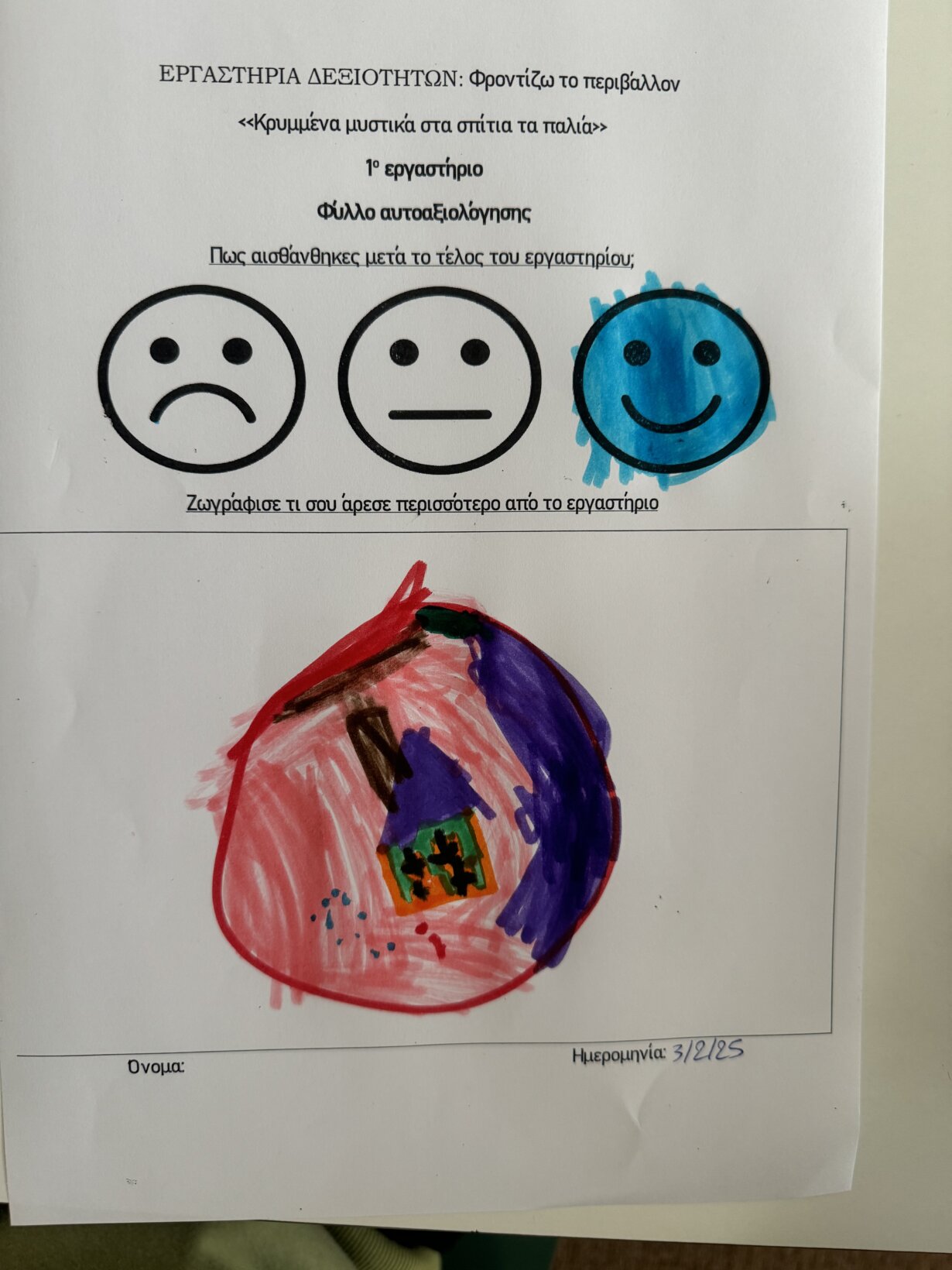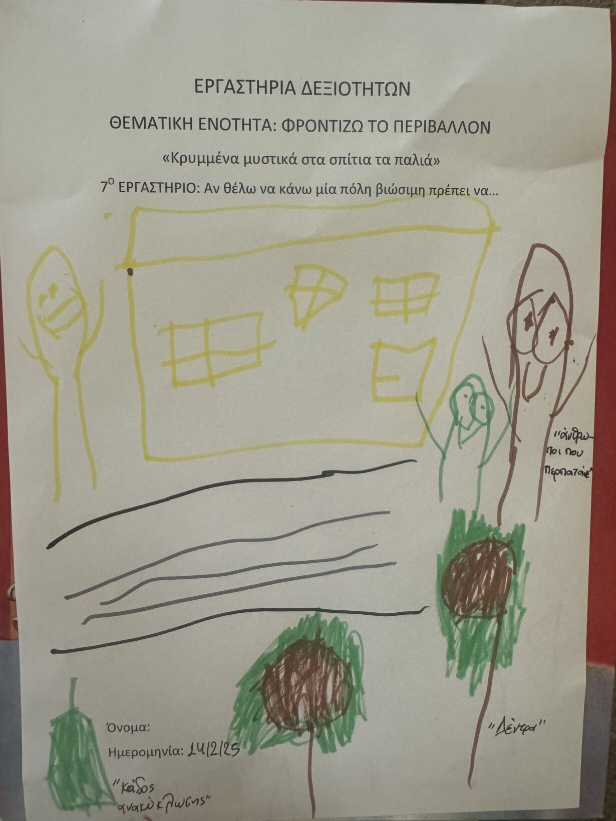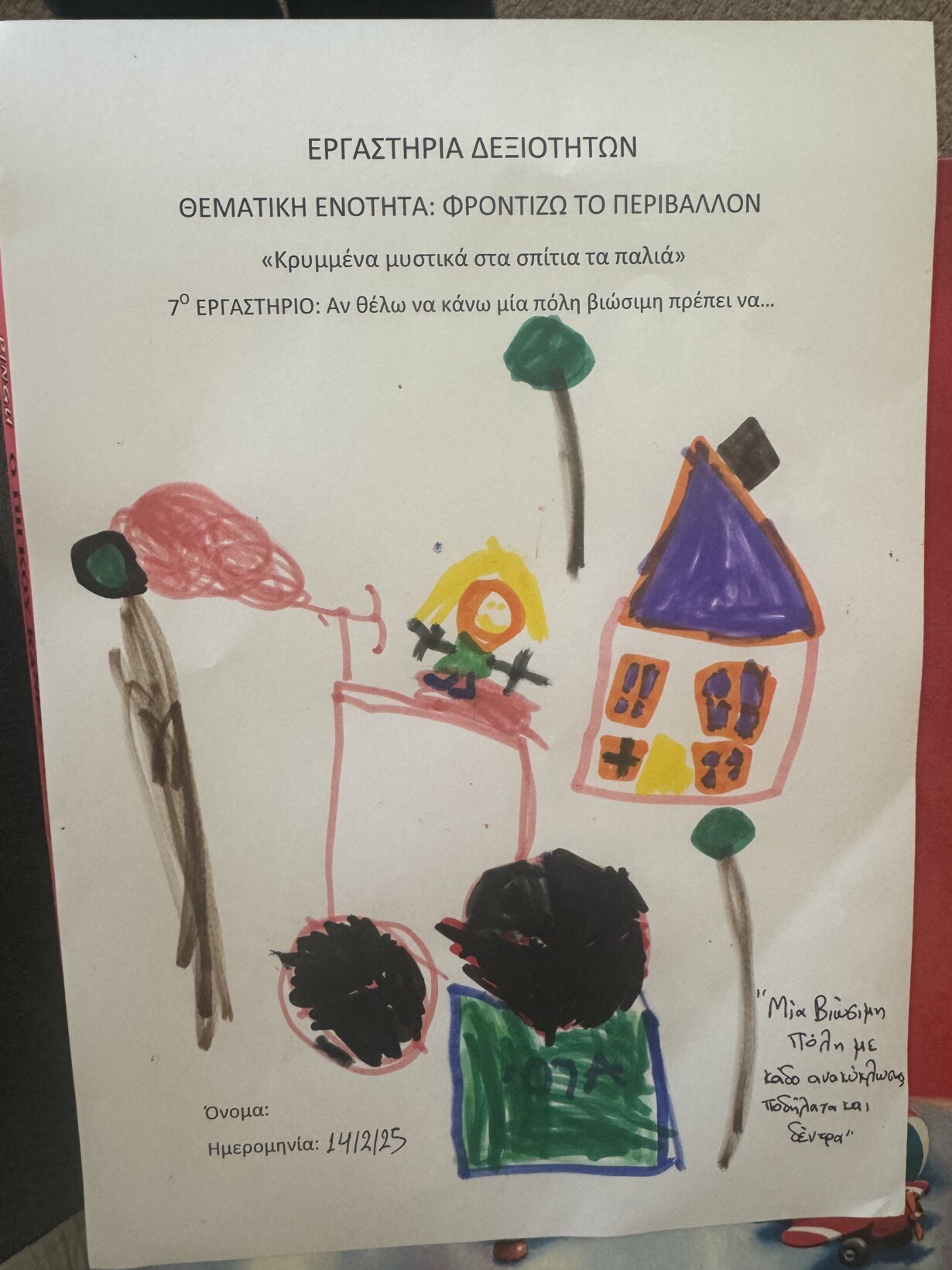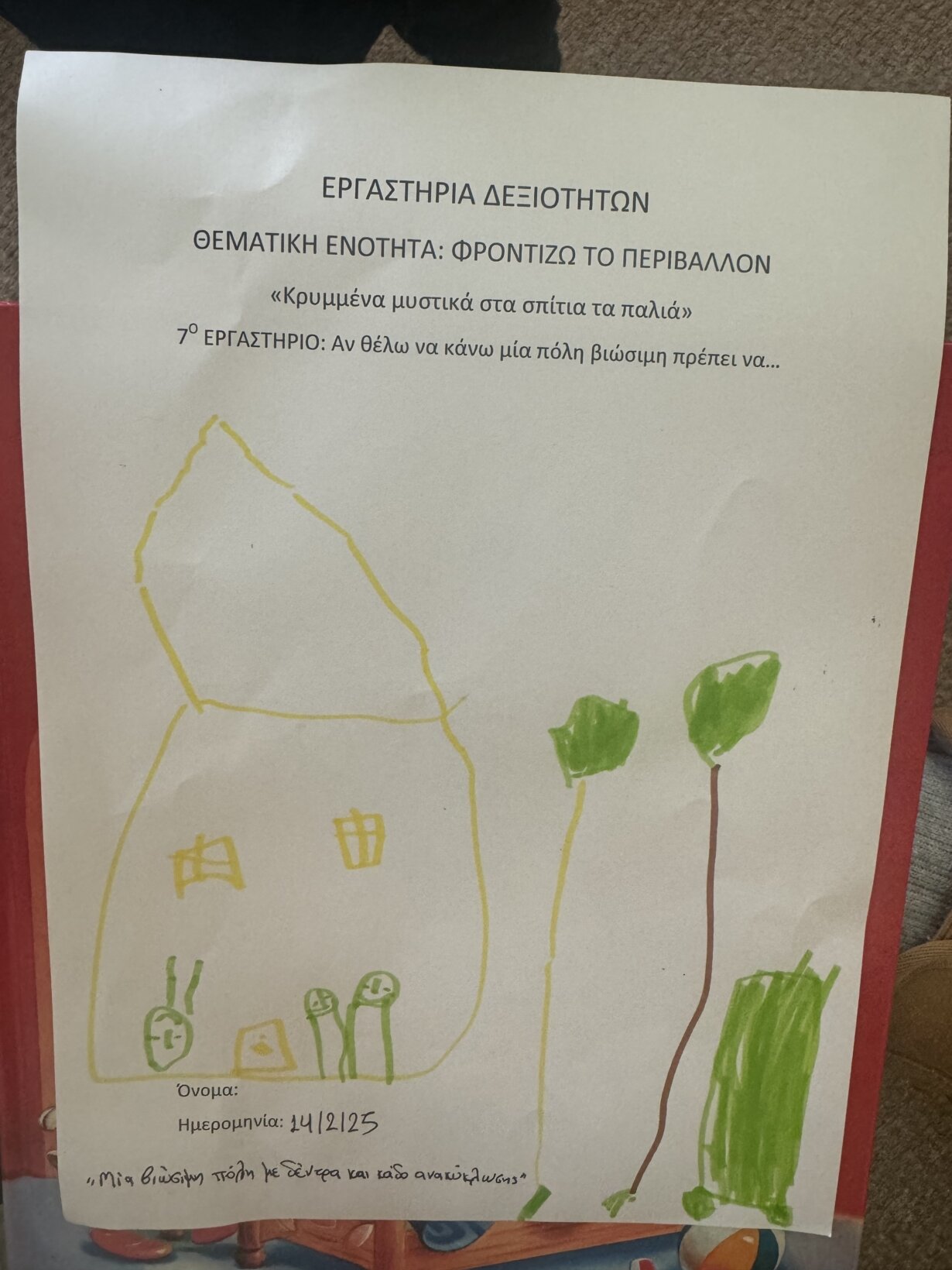 Τα παιδιά μέσω της ζωγραφικής τους έδειξαν πως κατανόησαν τα περί βιοκλιματικής σχεδίασης και κατασκευής  ενός σπιτιού, αφού ζωγράφισαν σπίτια που τα περιβάλλει η φύση, αλλά και σπίτια αναβαθμισμένα ενεργειακά με τη χρήση φωτοβολταϊκών συστημάτων στη σκεπή τους!
