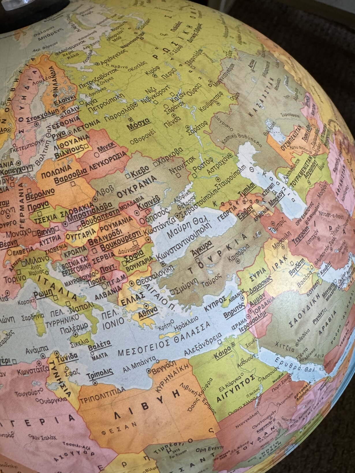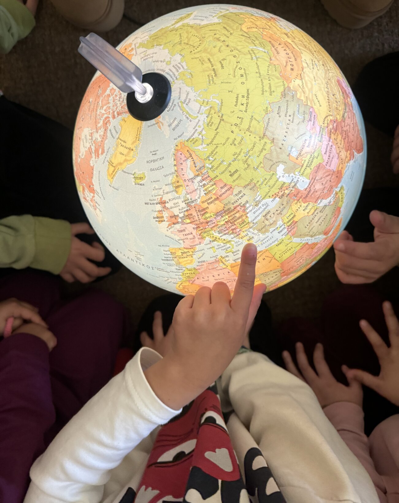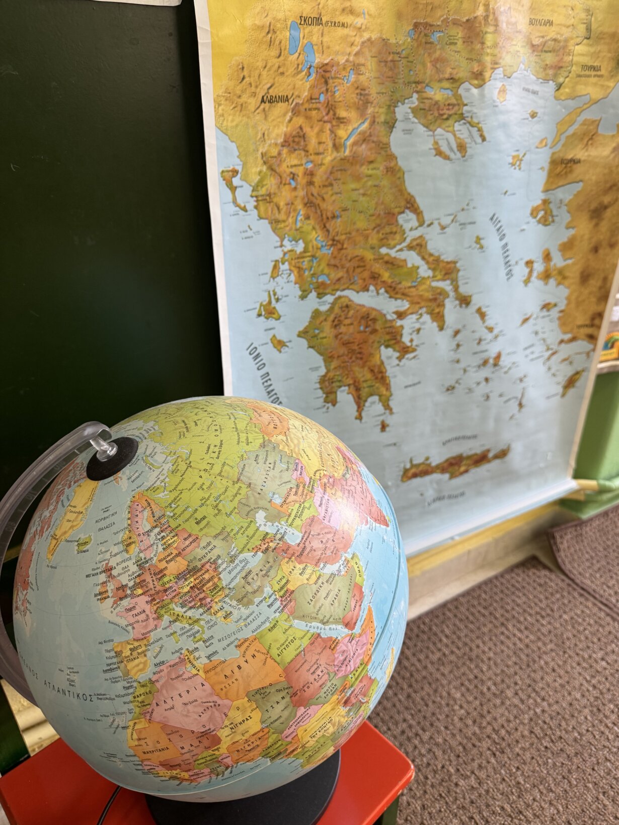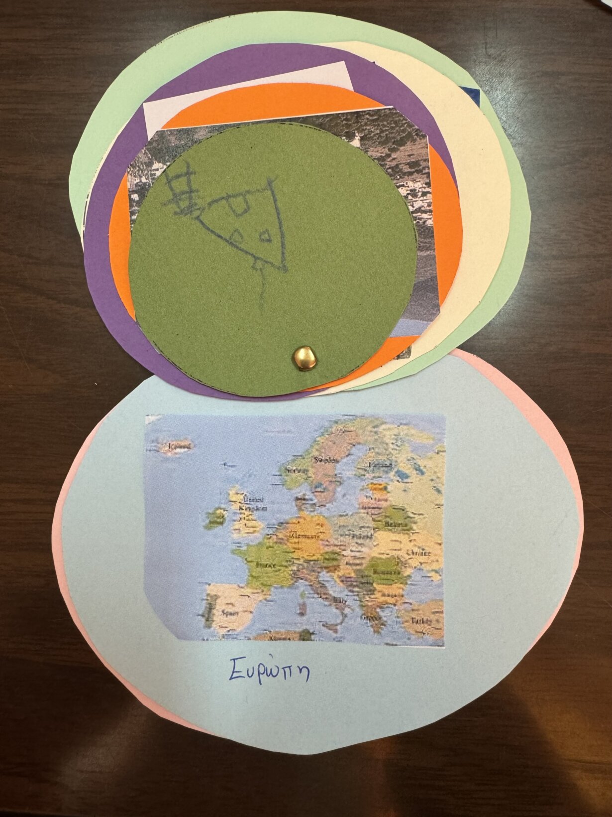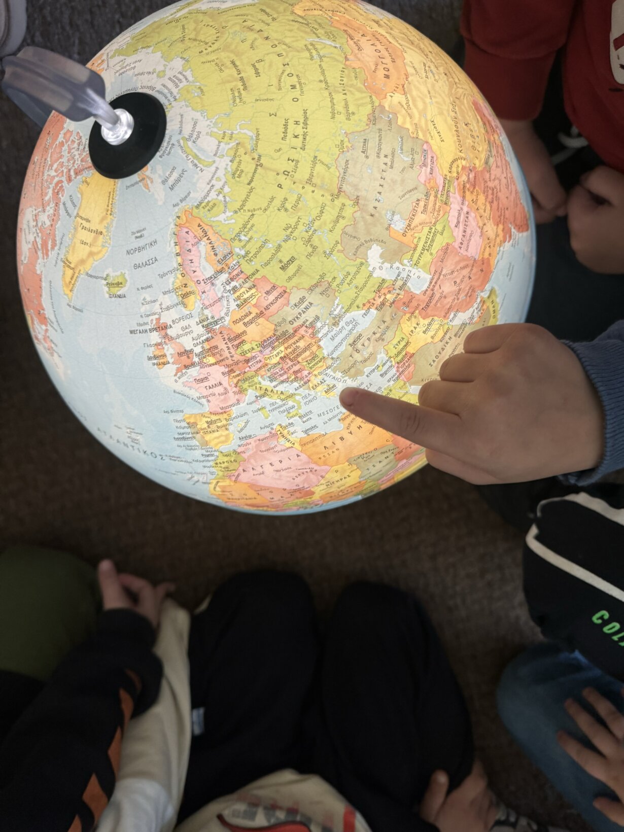 Ενώ παρατηρήσαμε και την υδρόγειο σφαίρα  τη γη, στη συνέχεια εντοπίσαμε  την Ευρώπη, ύστερα την Ελλάδα μας και μετά με τη βοήθεια του γεωφυσικού χάρτη εντοπίσαμε την Πελοπόννησο, και τον νομό μας την Λακωνία!