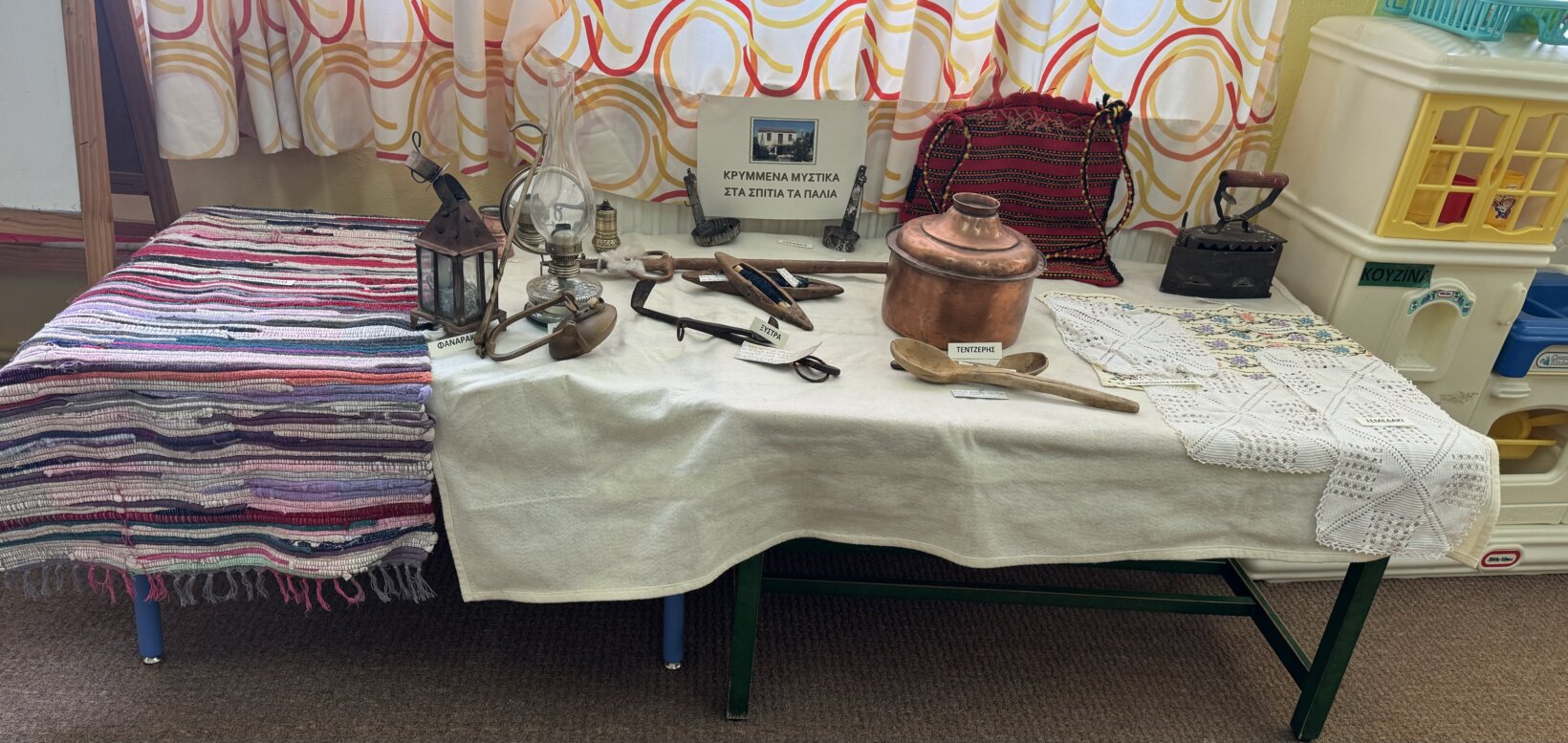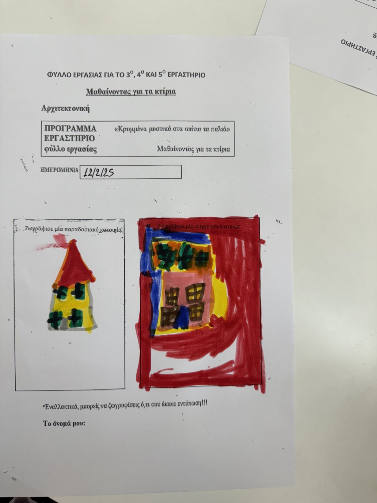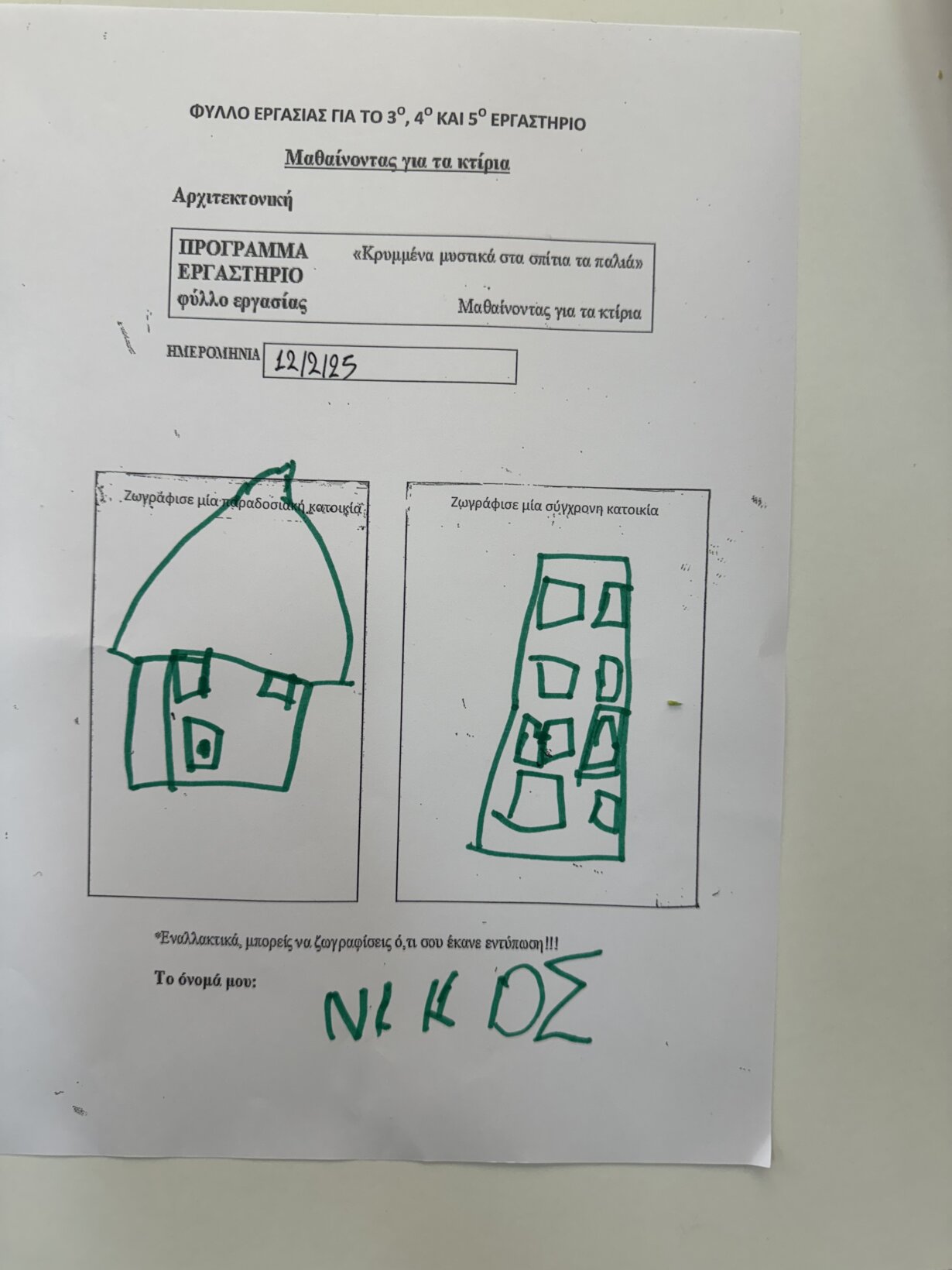Σε αυτό το εργαστήριο τα παιδιά παρακολούθησαν ένα βίντεο όπου μας έδειχνε τα παλαιά σπίτια, τον τρόπο χτισίματός τους, καθώς και τα οικιακά αντικείμενα που χρησιμοποιούσαν εκείνα τα χρόνια.