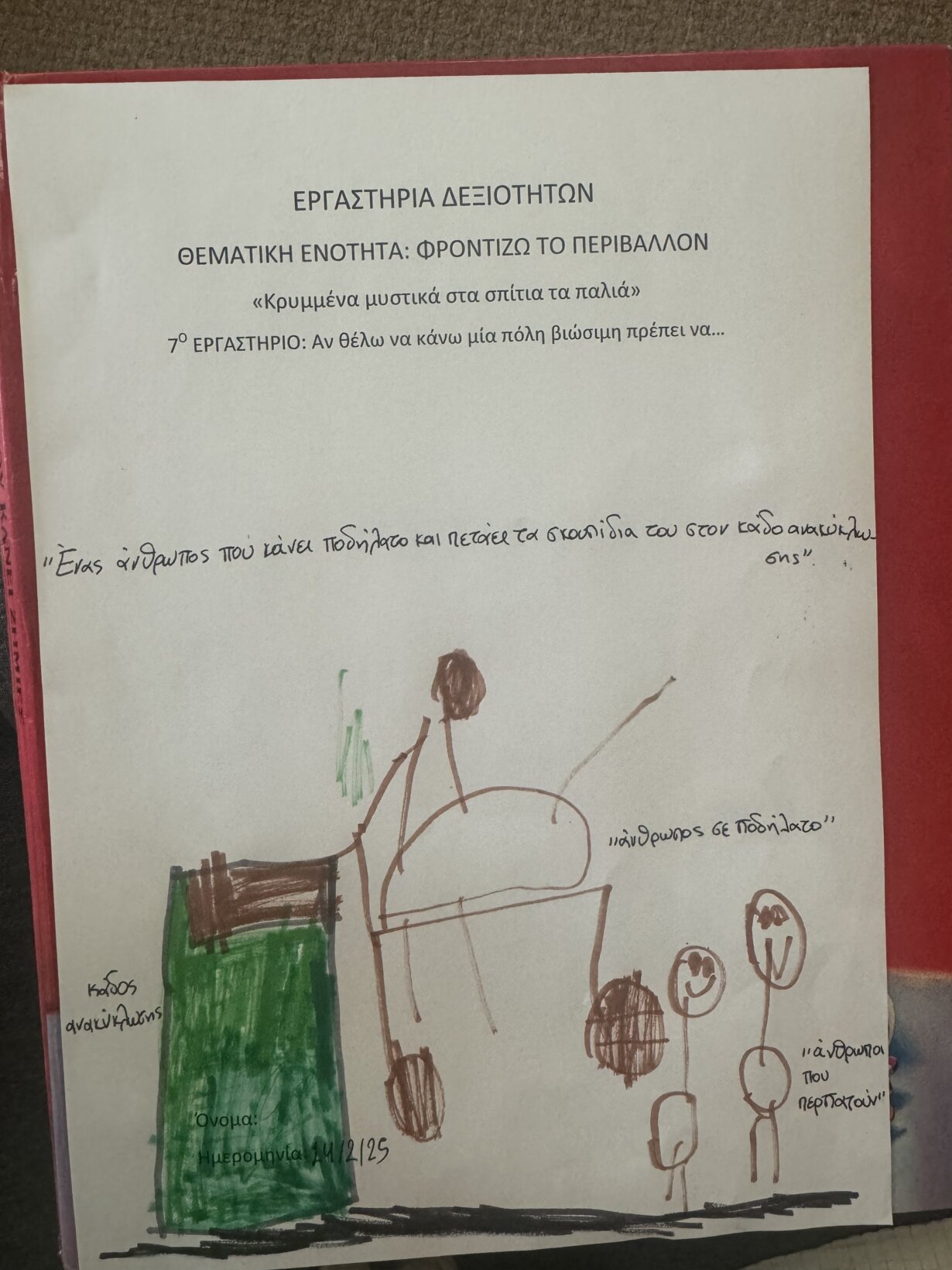 Μερικές λύσεις που προτάθηκαν από τα παιδιά όπως απεικονίζεται και στη ζωγραφική τους είναι,  η μετακίνηση μέσα στη πόλη με το ποδήλατο, με τα πόδια, η χρήση κάδων ανακύκλωσης και η τήρηση αυτών καθώς και η δενδροφύτευση!