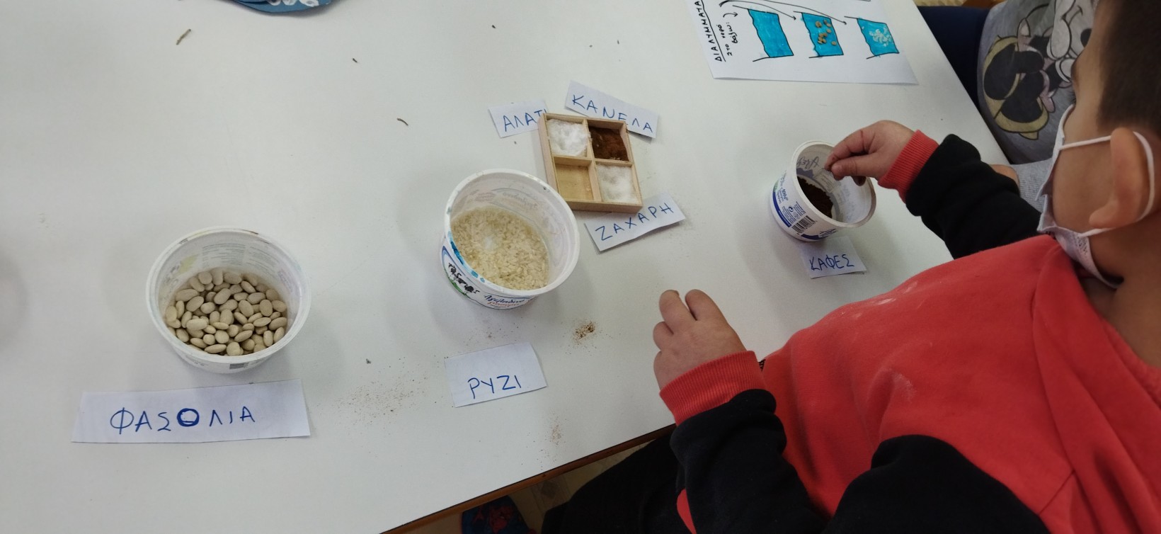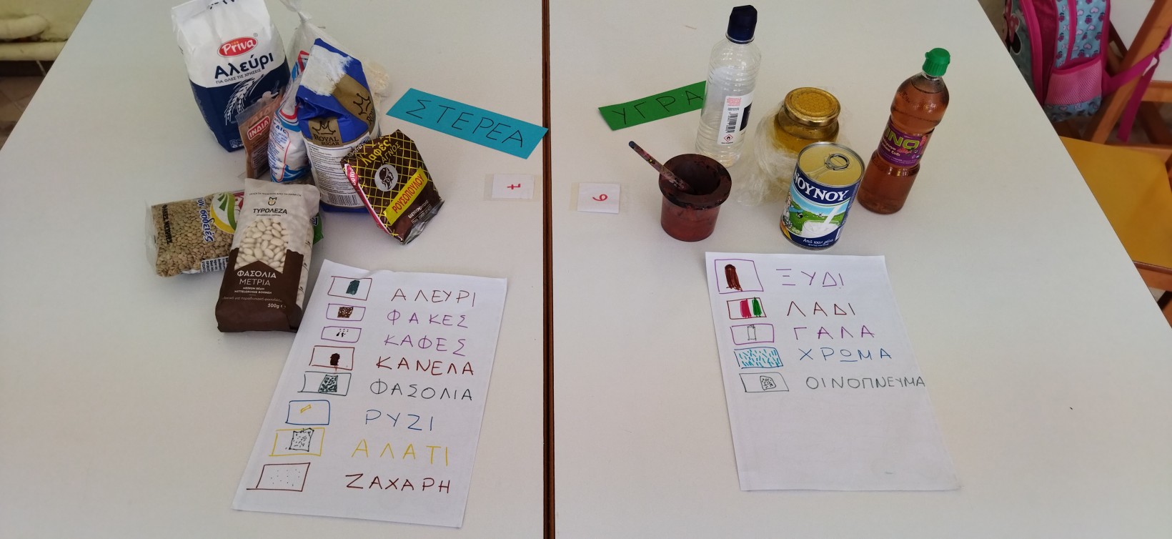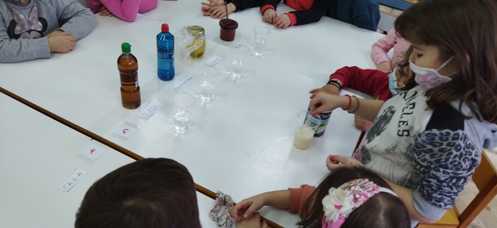 …ζητήσαμε από τους γονείς μας να φέρουμε στο σχολείο ποικίλα υλικά για τους πειραματισμούς μας, στερεά και υγρά… πχ φασόλια, ρύζι ,φακές, αλεύρι, γάλα, οινόπνευμα, ξύδι, ζάχαρη κλπ