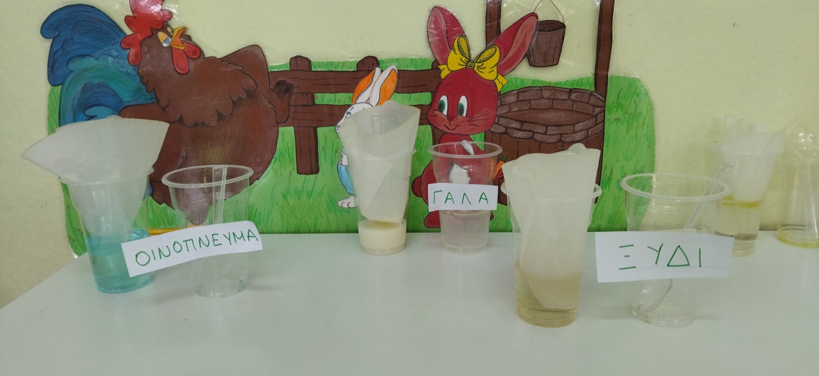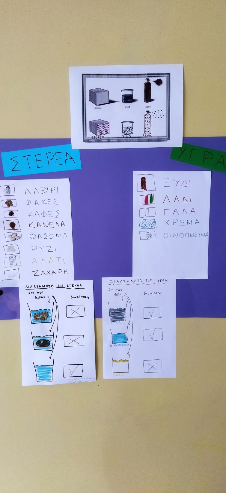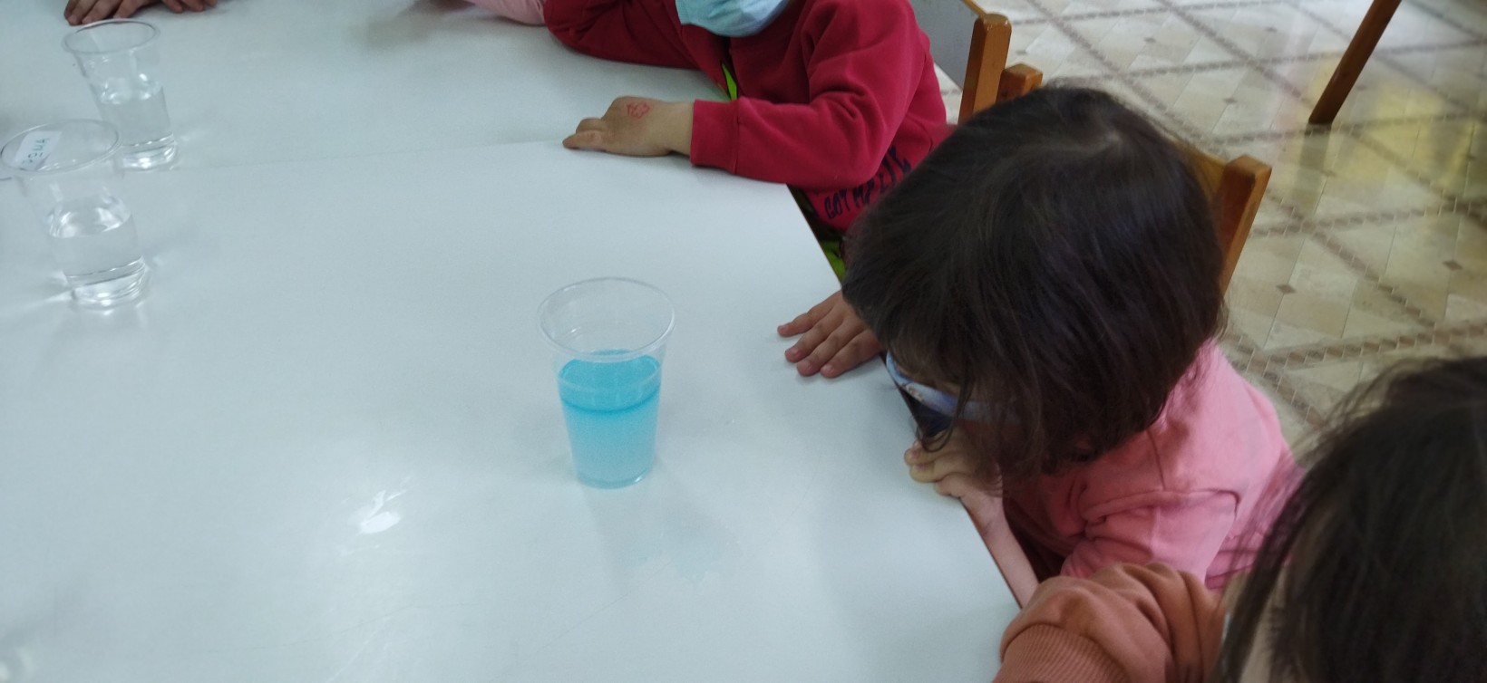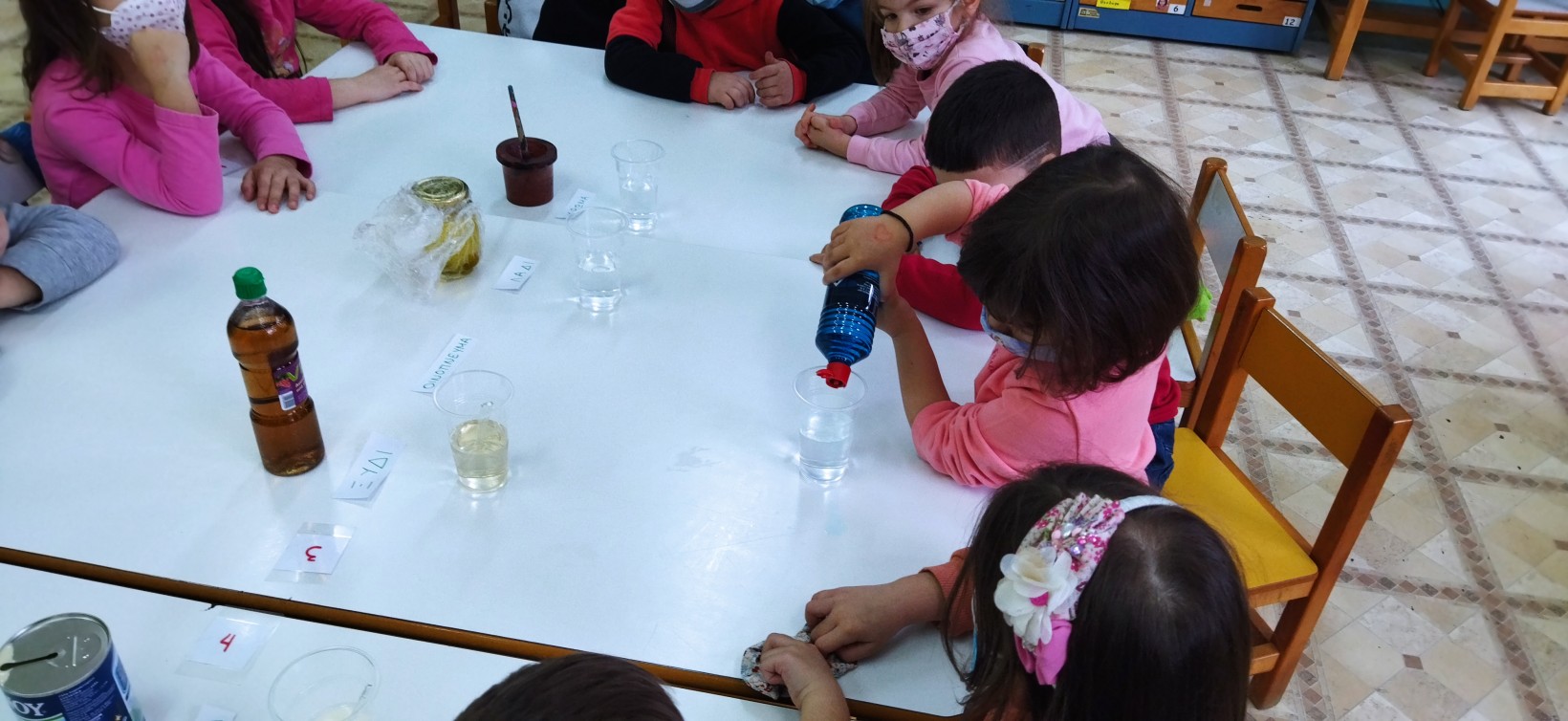 …αρχίσαμε τους πειραματισμούς με κάθε ομάδα ξεχωριστά, πρώτα το νερό με τα στερεά υλικά και έπειτα το νερό με τα υγρά υλικά και καταγράψαμε τις αντιδράσεις των υλικών ανά δύο (νερό-αλεύρι, νερό-αλάτι, νερό-φακές, νερό-οινόπνευμα κλπ) αν αναμιγνύονται ή όχι (αν είναι φίλοι του νερού ή όχι).