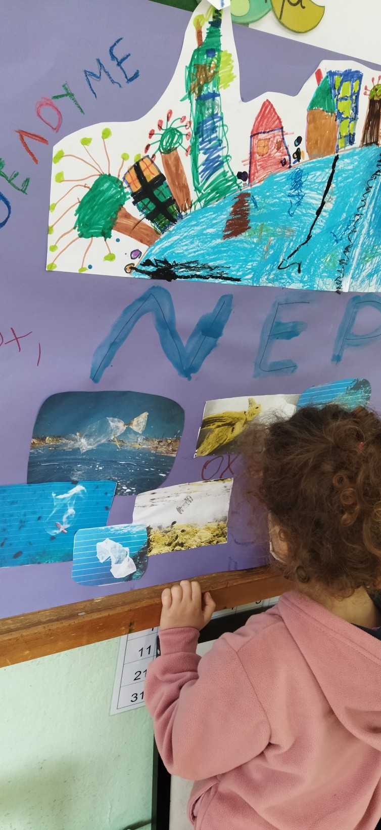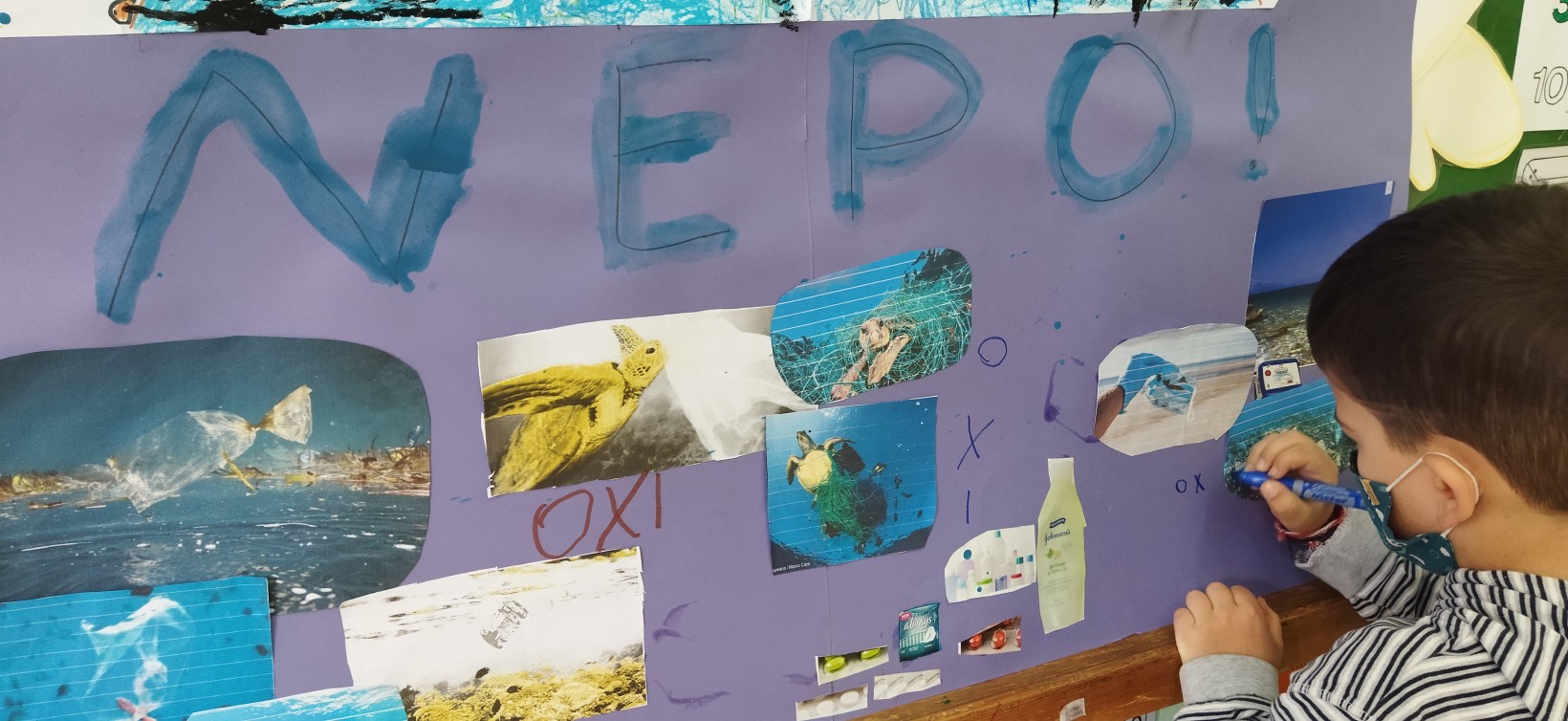 …το νερό που πίνουμε όμως φθάνει στην βρύση μας καθαρό και έτσι θέλουμε να παραμείνει για να είμαστε υγιείς. Ψάξαμε να βρούμε τι μπορεί να το μολύνει και μαζί με εμάς να δηλητηριάζει και να καταστρέφει και το θαλάσσιο οικοσύστημα…και βρήκαμε απόβλητα, σκουπίδια, πετρέλαιο, φυτοφάρμακα, πλαστικά. Φτιάξαμε λοιπόν μια αφίσα όπου θέλουμε να πούμε σε όλους ότι δεν θέλουμε σκουπίδια στην θάλασσα μας, ούτε πετρέλαιο, ούτε βλαβερές ουσίες…ΘΕΛΟΥΜΕ ΚΑΘΑΡΟ ΝΕΡΟ, θέλουμε όλοι να προσέξουν το νερό της Γης μας, γιατί είναι πολύτιμο!!!