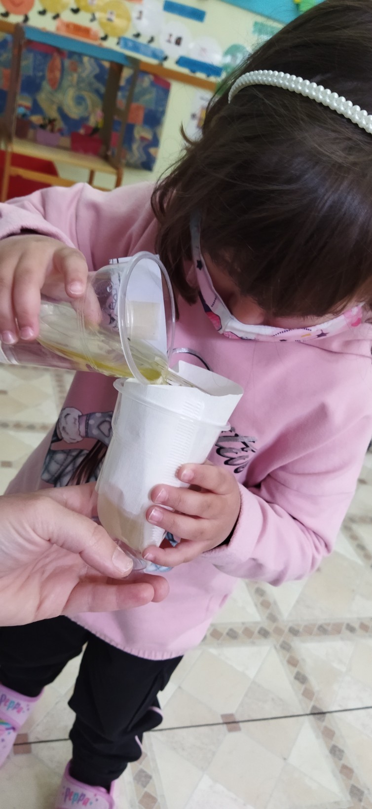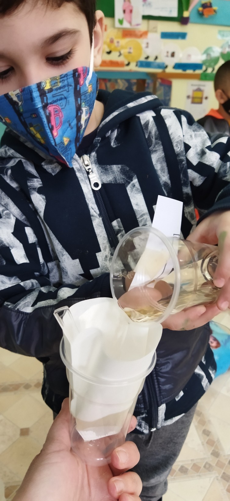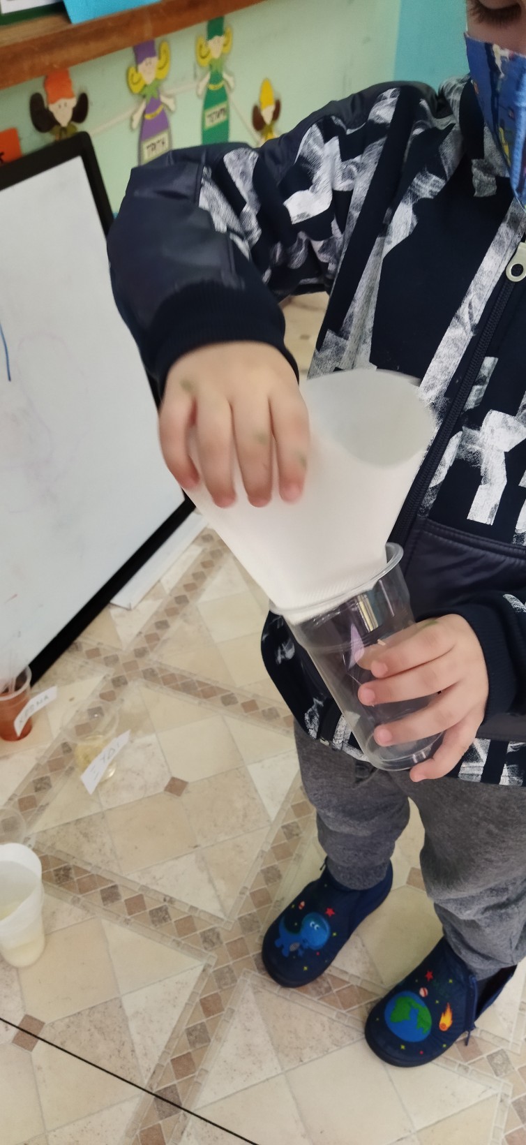 …οι πειραματισμοί μας συνεχίστηκαν με την αντίστροφη διαδικασία στα υγρά υλικά. Χρησιμοποιώντας ένα αυτοσχέδιο φίλτρο προσπαθήσαμε να διαχωρίσουμε τα διαλύμματά μας στα αρχικά τους στοιχεία. Παρατηρήσαμε ότι αυτό είναι δύσκολο να γίνει, χρειάζεται εξειδικευμένα μηχανήματα και φίλτρα έτσι ώστε να γίνει κάποιος τέτοιος διαχωρισμός και το νερό να γίνει και πάλι καθαρό και πόσιμο.