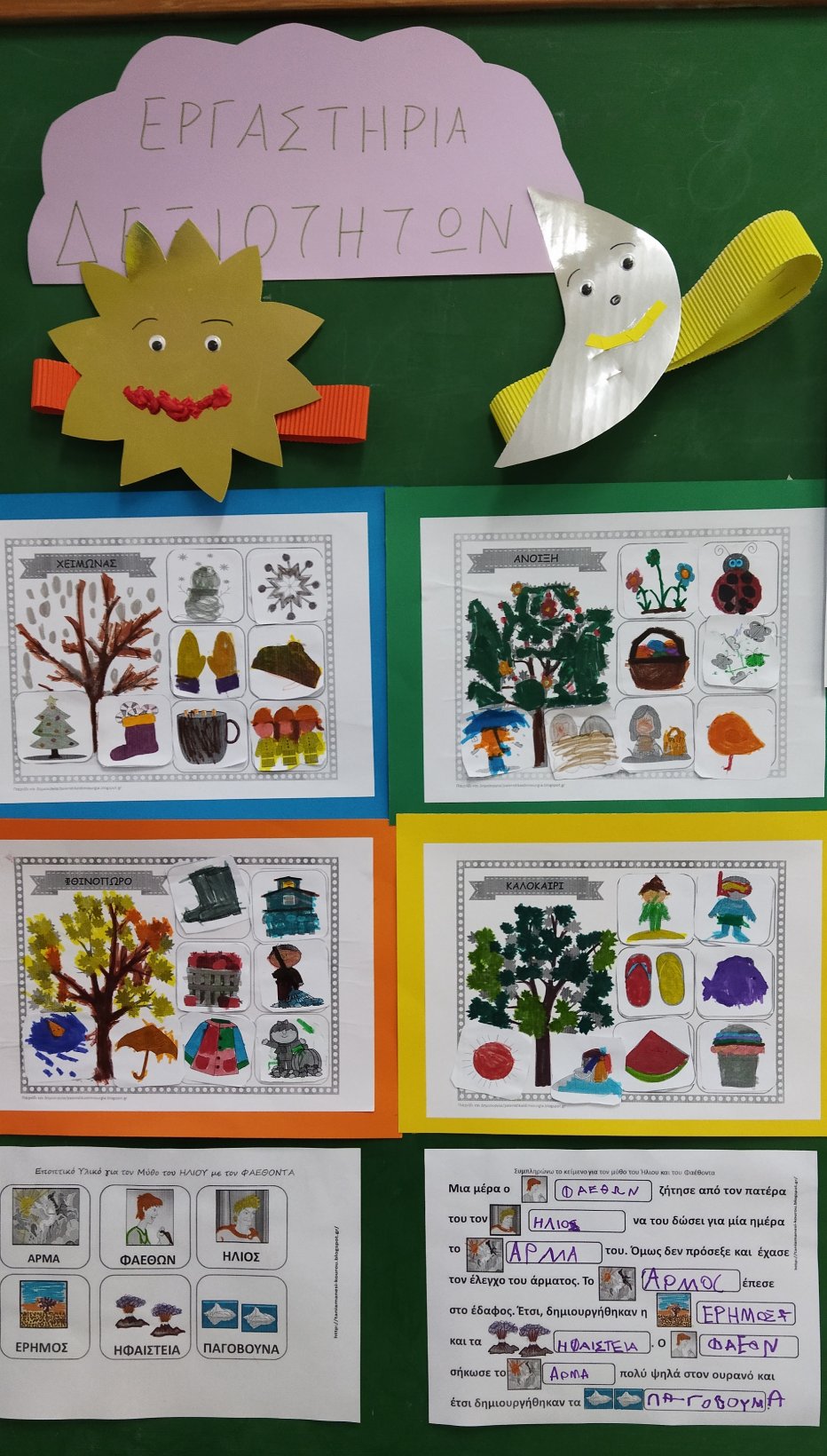 Ξεκινήσαμε το εργαστήριό μας με την αναγνώριση των εποχών, το μοτίβο τους, τις ιδιαιτερότητές τους , τις διαφορές τους, τι αλλάζει στην φύση και πώς το αντιλαμβάνονται οι άνθρωποι. Δραματοποιήσαμε το κείμενο “Ο ήλιος και το νερό” από το Ανθολόγιο του νηπιαγωγείου και συνεχίσαμε με τον μύθο του Φαέθωνα,τον γιο του Ήλιου., και αντιληφθήκαμε όλα τα καλά που μας δίνει ο ήλιος καθώς και όλα τα άσχημα που μπορεί να προκαλέσει η ηλιακή ακτινοβολία. Σε αυτό μας βοήθησαν και τα βίντεο από το Πλανητάριο της Θεσσαλονίκης.