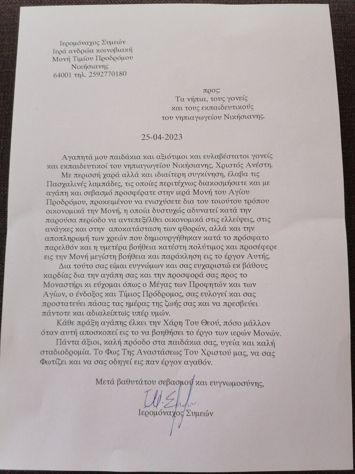 - Η προσφορά μας προς την Ιερά Μονή Τιμίου Προδρόμου Νικήσιανης