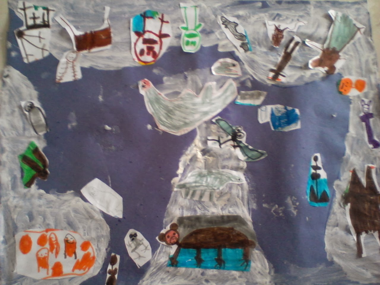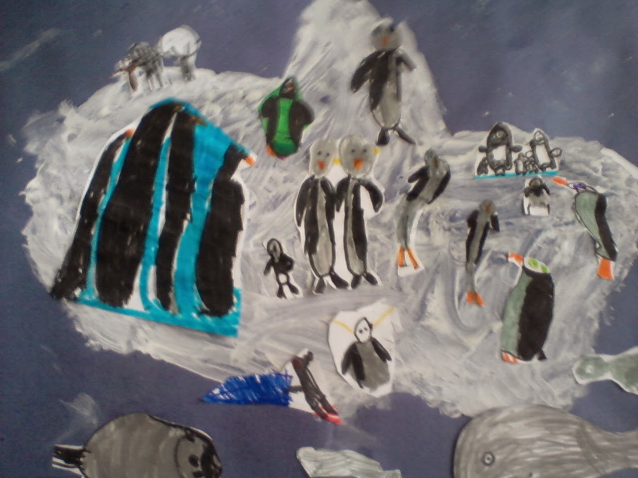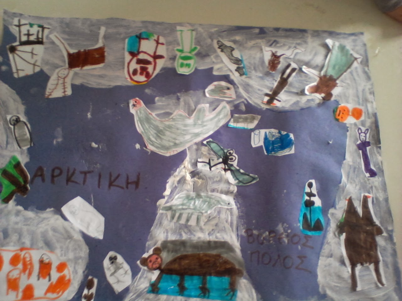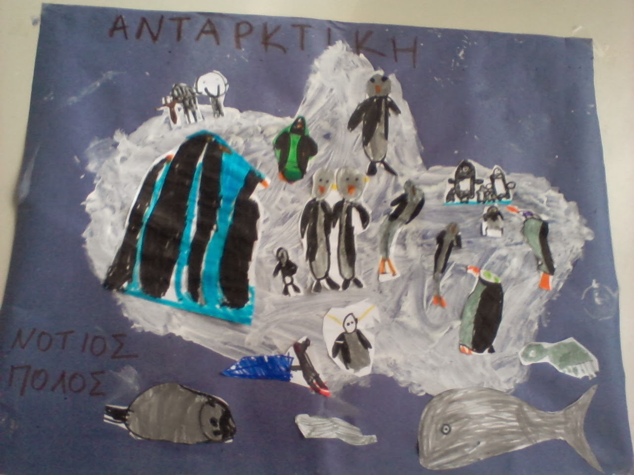 Έτσι στραφήκαμε στην υδρόγειο για να δούμε πού είναι ο βόρειος και ο νότιος πόλος. Μάθαμε ότι ο νότιος πόλος λέγεται Ανταρκτική και ο βόρειος Αρκτική. Σειρά είχε λοιπόν να δούμε και να ζωγραφίσουμε τα ζώα που ζουν σε κάθε περιοχή. Επόμενο βήμα ο χωρισμός σε ομάδες και η κατασκευή μιας μακέτας.