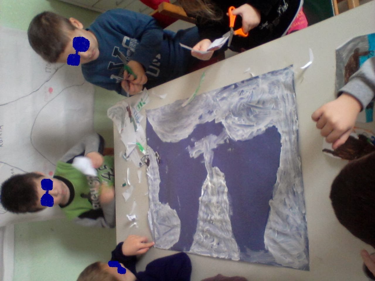 Έτσι στραφήκαμε στην υδρόγειο για να δούμε πού είναι ο βόρειος και ο νότιος πόλος. Μάθαμε ότι ο νότιος πόλος λέγεται Ανταρκτική και ο βόρειος Αρκτική. Σειρά είχε λοιπόν να δούμε και να ζωγραφίσουμε τα ζώα που ζουν σε κάθε περιοχή. Επόμενο βήμα ο χωρισμός σε ομάδες και η κατασκευή μιας μακέτας.